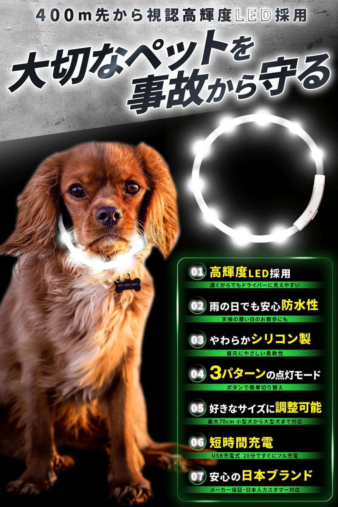 【400m先まで視認できる高輝度LED採用】光る首輪は高輝度LEDを採用。400m先から視認することができ犬の夜間の散歩中の事故防止に安心です。 【長さ調節機能】最大70cmまで、はさみで好きな位置にカットして長さを調節することができます。小型犬、中型犬、大型犬と幅広く対応しています。大型犬では個体差により首の大きなワンちゃんはご購入前に首周りのサイズを一度測定してご確認をお願いします。 【首が痛くならないフレキシブル素材】犬用首輪はやわらかいシリコン製のチューブでできています。首にはめても痛くならず安心です。また、小さく折りたたんでバッグに入れておくにも便利です。 【雨の日でも安心防水性】光る首輪は防水性のため、雨の日のお散歩にもお使いいただけます。※生活防水レベルです。お風呂やプールには入れないでください。 【USB充電式】20分でフル充電することができます。点灯時間は、カラーと点灯モードにより異なります。 カラー虹色の場合: 虹色点滅モード 約70分その後暗くなり赤色のみ点滅していきます。 白色点滅モード 2時間弱 カラー単色(オレンジや青など虹色以外)の場合: 連続点灯モード 約90分 その後少しずつ暗くなっていきます。 点滅モード 約2時間その後少しずつ暗くなっていきます。