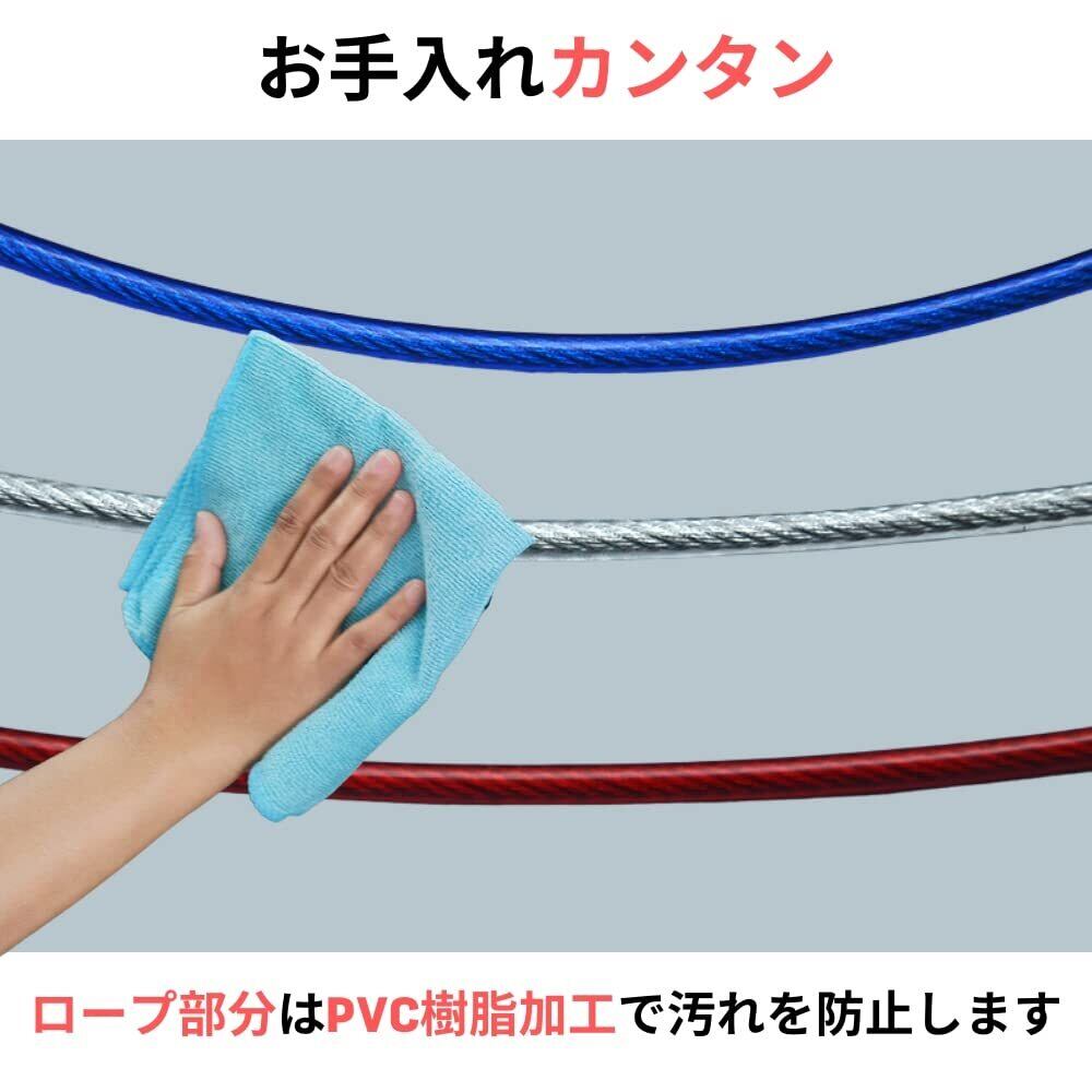 【商品内容】本体サイズ:5m 太さ 4.7mm 重量:260g 耐荷重:80kg、ロープ部分材質:スチールワイヤー(PVC樹脂加工)、金具部分材質(両端):合金