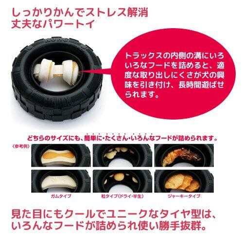 楽しく遊びながら、しっかり噛んでストレスを解消する丈夫な犬用パワートイ。 見た目にもクールでユニークなタイヤ型で、いろいろなフードが詰められて使い勝手抜群。 ・良質な天然ゴム100%使用 ・丈夫で長持ちするゴムで、噛む力の強い犬に最適 ・タイヤの内側に、いろいろなフードをたっぷり詰められ。長時間、犬を遊ばせることができます。 ・犬のストレス解消やお留守番に役立ちます。
