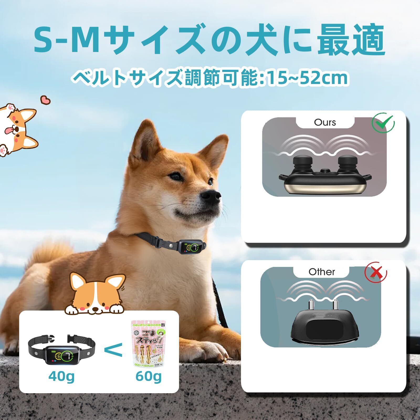 【小型犬にぴったり】 より小さく、より薄く、より軽く、よりスタイリッシュ、小型犬吠え首輪はS-Mサイズの犬や子犬のために設計されています。本体40gの超軽量で、愛犬に負担軽減可能です。体重2kg ~ 30kg、首のサイズは 15 ~ 55 cmの小中型犬用に最適です。小中型犬の吠え止め首輪として理想的です。