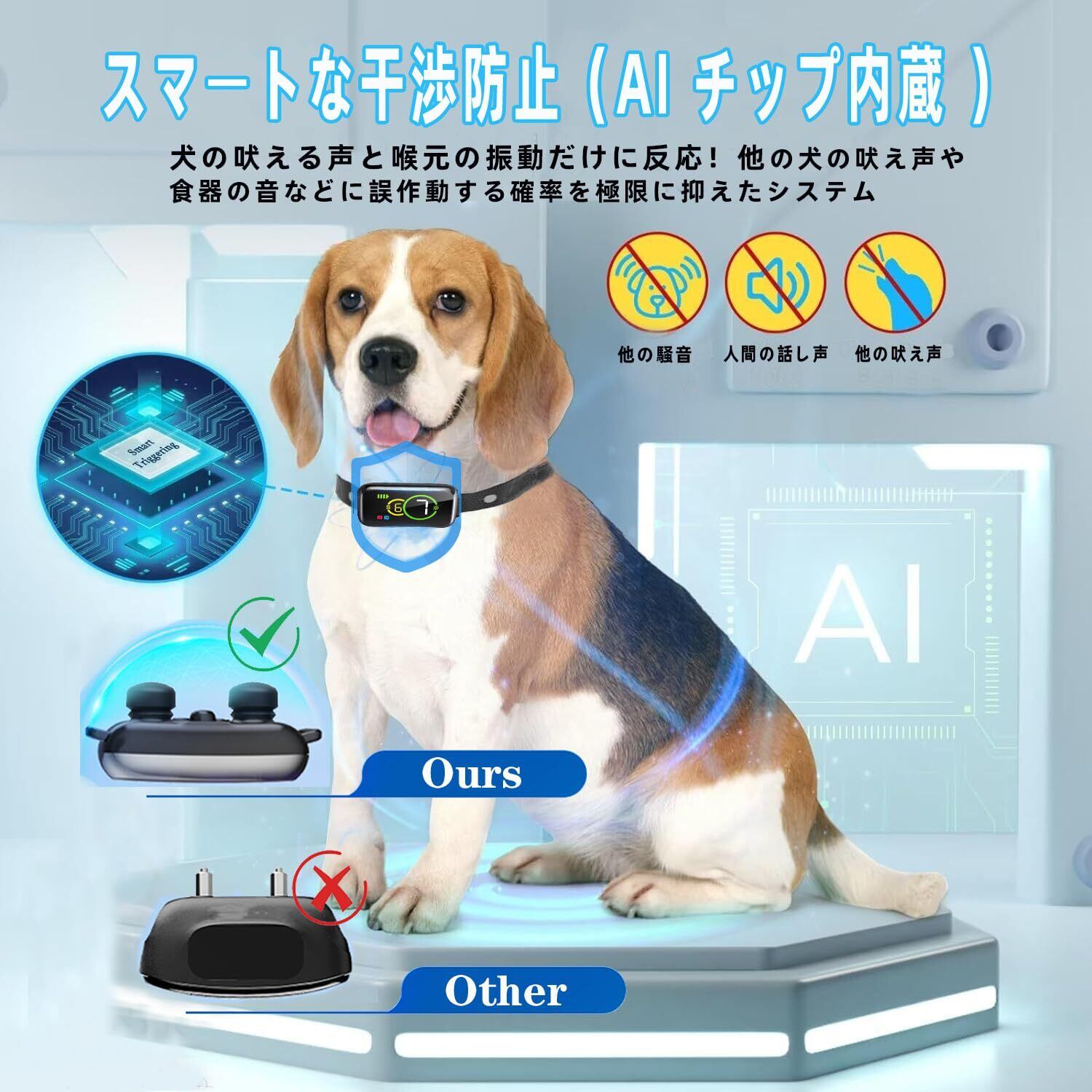 【最新AIセンシング システム】 スマートセンサーとチップを装備した無駄吠え防止首輪は、特定の周波数とデシベルで犬の吠え声を検出し、他の音や他の犬による誤った刺激がなくなります。アップグレードされたプロセッサーは、遅延なく0.01秒以内に作動し、効果的に無駄吠えを防止します。