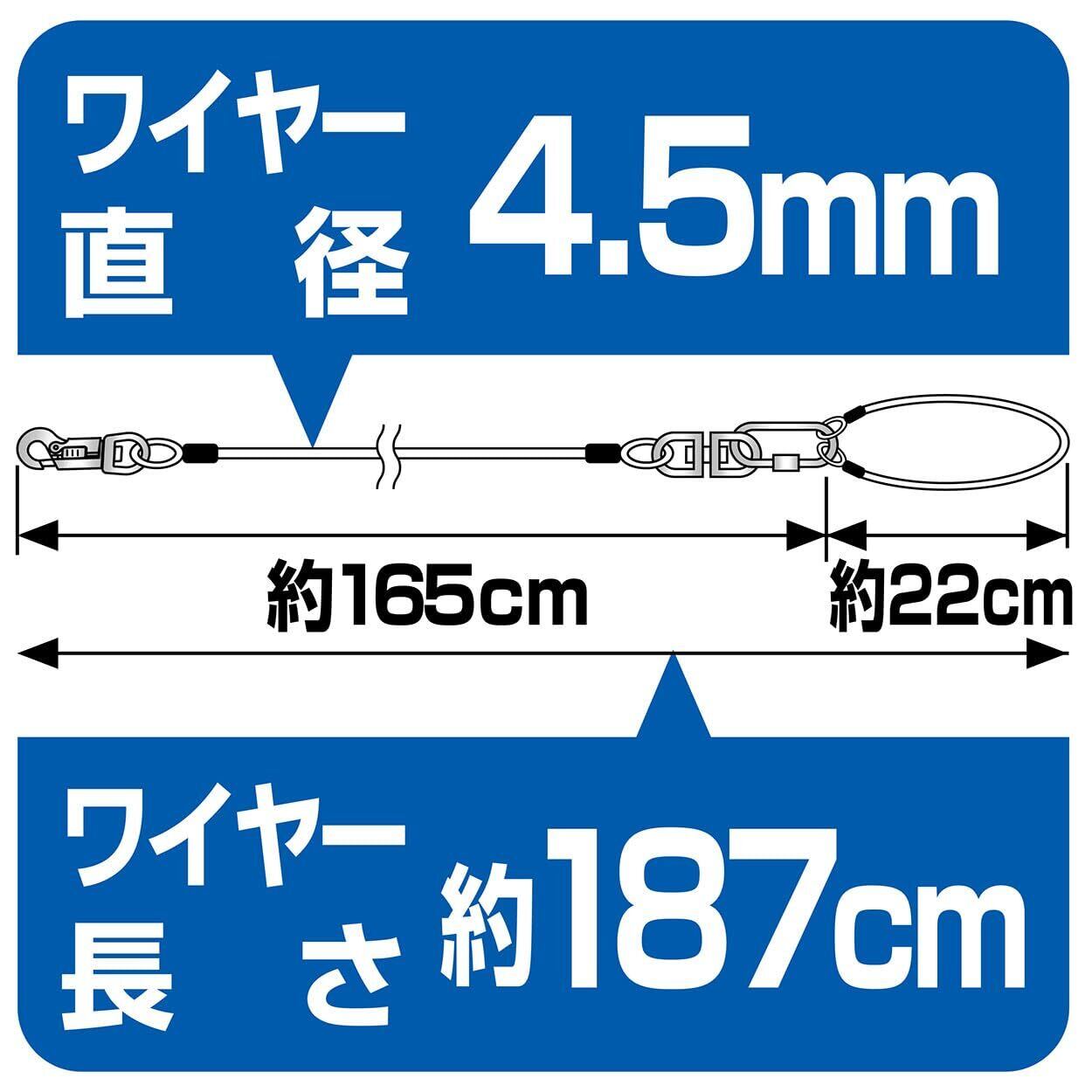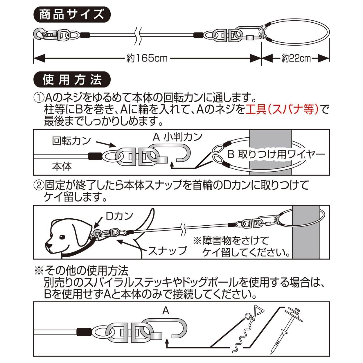 ●本品は犬用です。犬以外には使用しないでください。●事故防止のため、適応体重以外の犬には使用しないでください。ただし、犬の習性を十分に理解したうえで、強く引く場合は適応体重に余裕のある製品を購入してください。●人やペットが破片等を誤飲しないように注意してください。万一、誤飲した場合は各医師に相談してください。●本品は犬をつなぎ留めておくためのケイ留用です。ケイ留以外の用途に使用しないでください。●本品を正しく使用してください。使用方法の誤りや分解・修理・改造等による事故については、一切責任を負いません。●使用する際は、ドッグポール等のケイ留用品を使用してください。●使用前に必ずロープのねじれた部分をまっすぐに伸ばし、ねじれの無い状態で使用してください。●子供が使用する場合は、必ず大人が立ち会ってください。●本品は消耗品ですので、使用前には必ず点検し、6ヶ月前後を目安として亀裂・サビ等の傷みが目立ち始めたら新しい製品に買い替えてください。●本品は、ペットがかんだり引っかく等すると、切れたり破損します。●かみぐせのある犬には使用しないでください。●犬が嫌がる場合は、無理に使用しないでください。●ケイ留場所を設定する際は、犬が動く範囲に障害物がないか確認してください。●取りつけ用ワイヤーを使用して長時間ケイ留する場合は、破損等がないか定期的に確認してください。また、犬が届かない高さにケイ留してください。●火気や水気のそばでの使用や保管はしないでください。●幼児・子供・ペットのふれない所に保管してください。●操作する時には、ツメ割れ等に十分注意してください。●ロックウィングやスライドレバーの動作不良には十分注意し、不具合が生じた場合は、直ちに使用を中止してください。