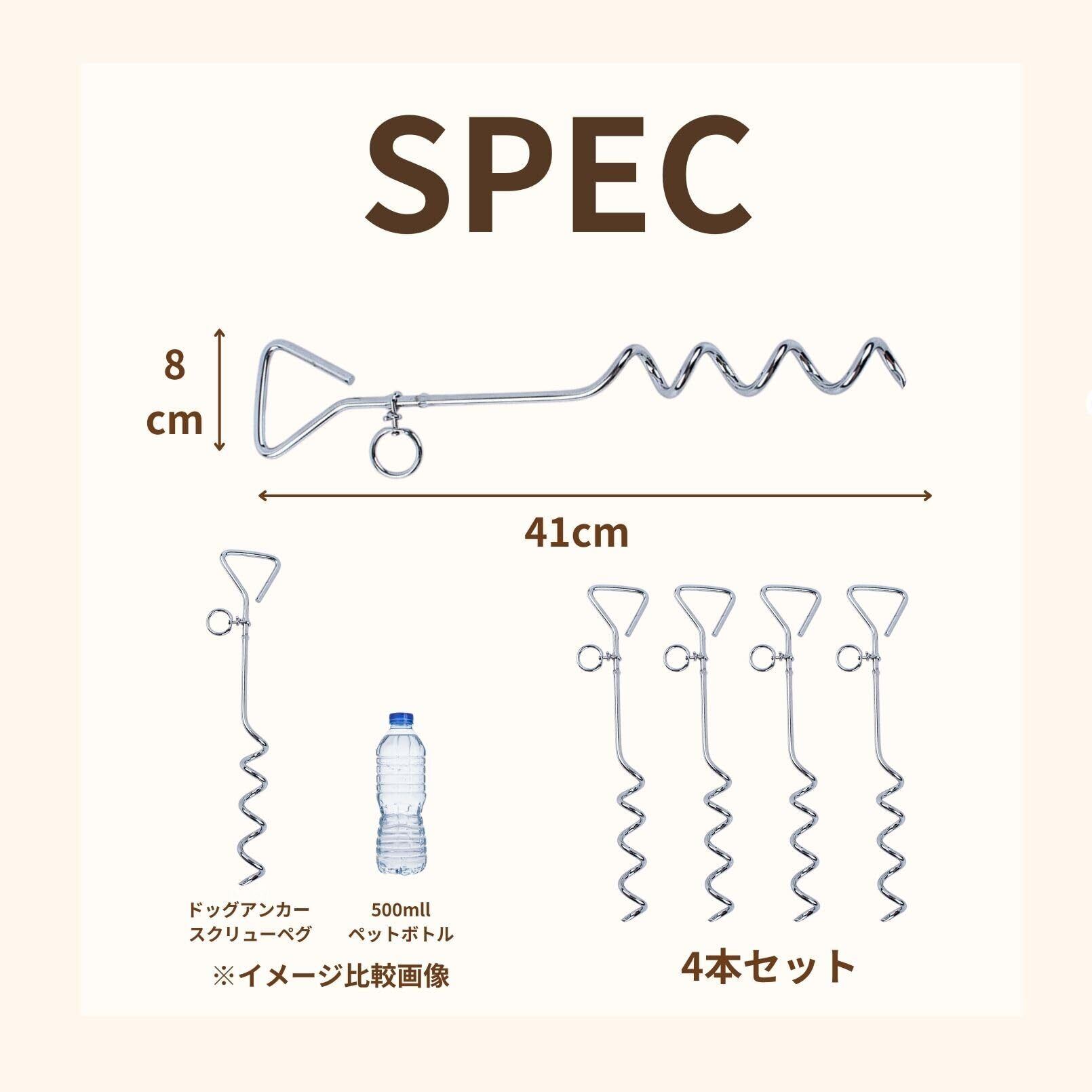 セット内容:ドッグポール×4本 サイズ:全長約41cm / ヘッド幅約8cm 材質:亜鉛メッキ加工(サビ防止) ※岩場や硬い地面では使用できない場合がございます。ドリル先端は鋭利なため、安全にご注意のうえご使用ください。