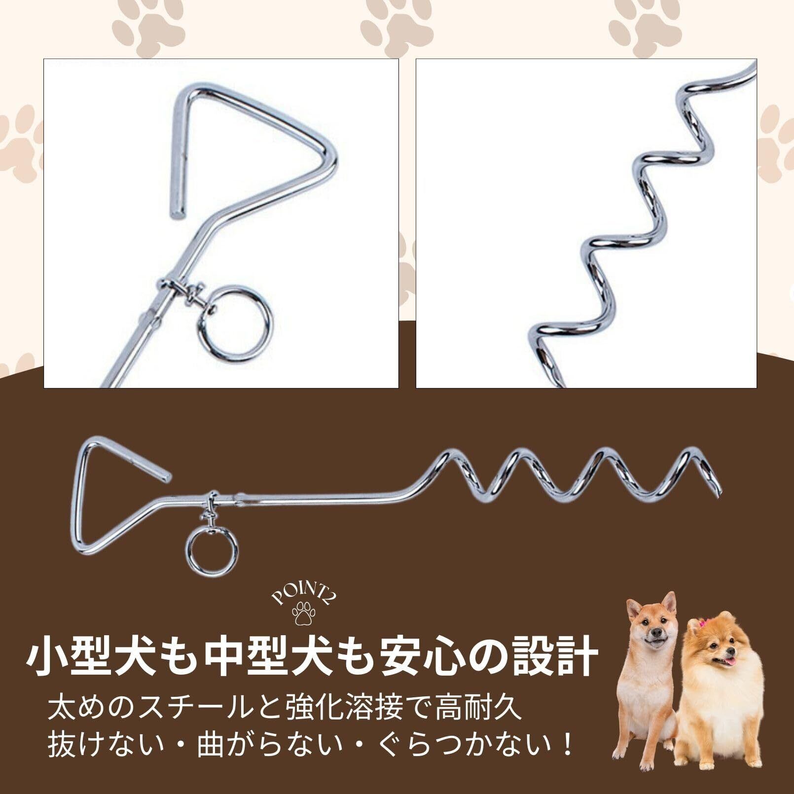 スパイラル状の先端を地面に差し込んでクルクル回すだけ。重さと形状でしっかり地面に食い込み、小型犬・中型犬の引っ張りにも耐えられる安定性。工具不要、女性でも簡単に設置可能です。
