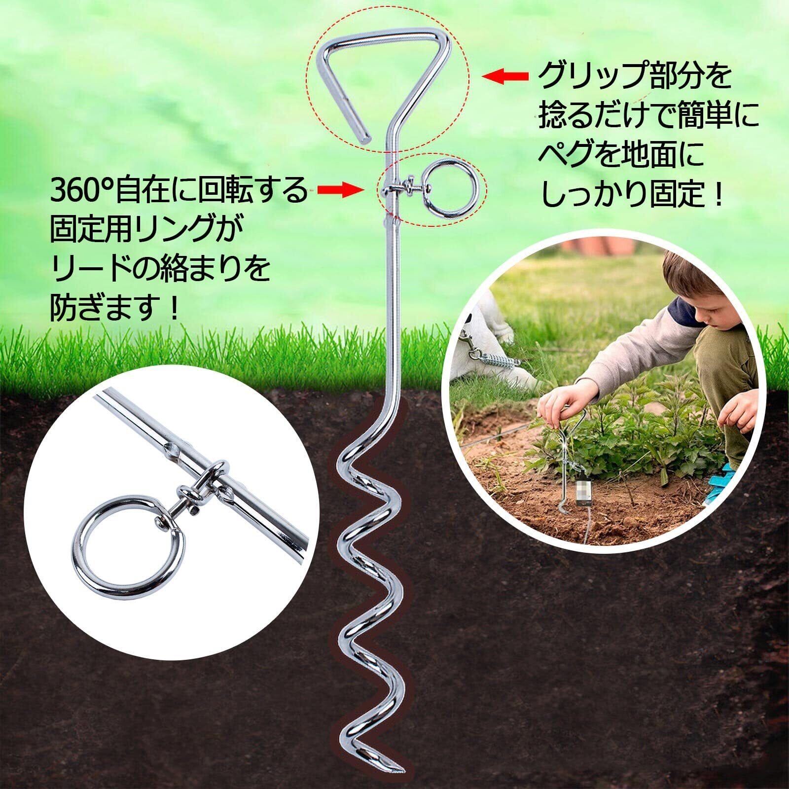 使用方法も簡単です。1,ドッグポール先端を係留しておきたい場所へセット 2,ヘッド部が土表面につくまで深くねじ込みます 3,先端のリングにご使用されているリードを掛けてお使い下さい