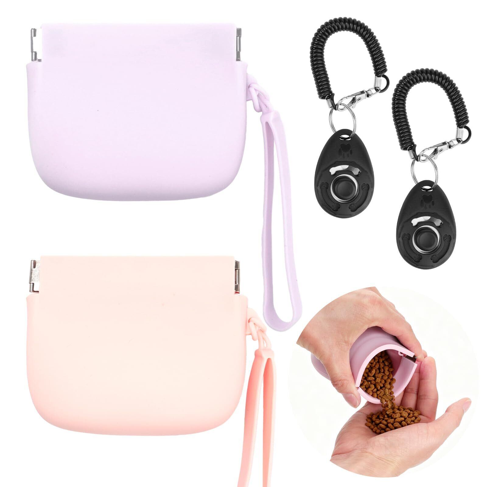 VOSO 2個セット シリコン製ドッグトリーツポーチ 小型ペットおやつバッグ 犬猫用|自動開閉機能付き|トレーニングクリッカー付き|ポケットサイズ・お手入れ簡単・無臭|ペットの旅行やアウトドアに最適 (ピンクとライトパープル)