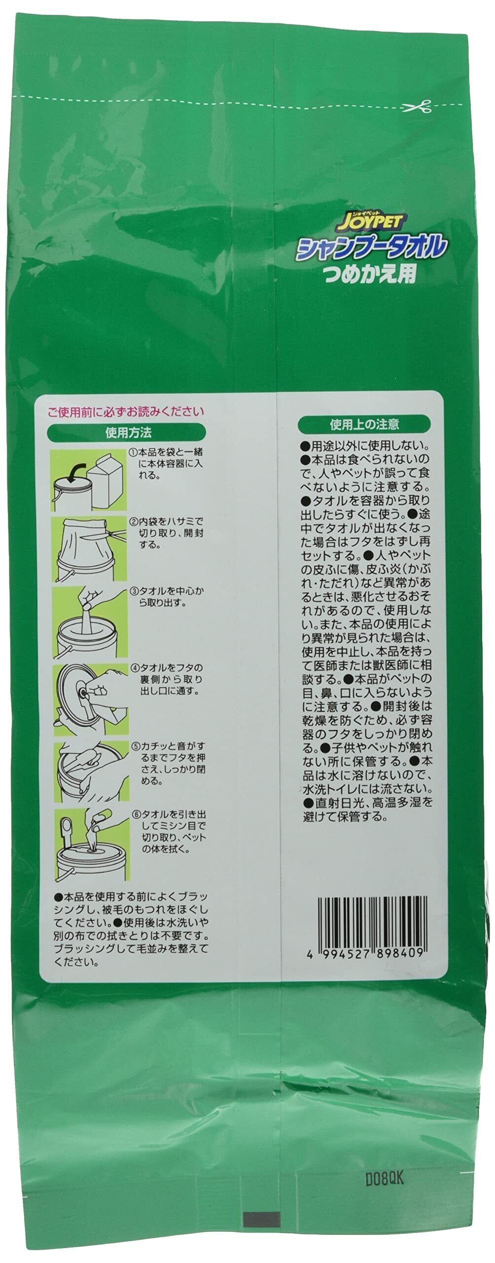 ● シートの繊維が汚れ・ハウスダスト・花粉をしっかりキャッチ。 ● なめても安心な洗浄成分(食品添加物)、弱酸性、低刺激処方。 ● コラーゲンとプラセンタエキスが皮ふと被毛にうるおいと輝きを与える。 ● 毎日の皮ふ・被毛ケアに。 ● お散歩前後、シャンプーができない時などの汚れ落としに。 使用方法 1うち袋をハサミで切り取り、開封する2タオルを中心から取り出す3タオルをフタの裏側から、取り出し口に通す4カチッと音がするまでフタを押さえてしっかり閉める5タオルを引き出してミシン目で切り取りペットのカラダを拭く