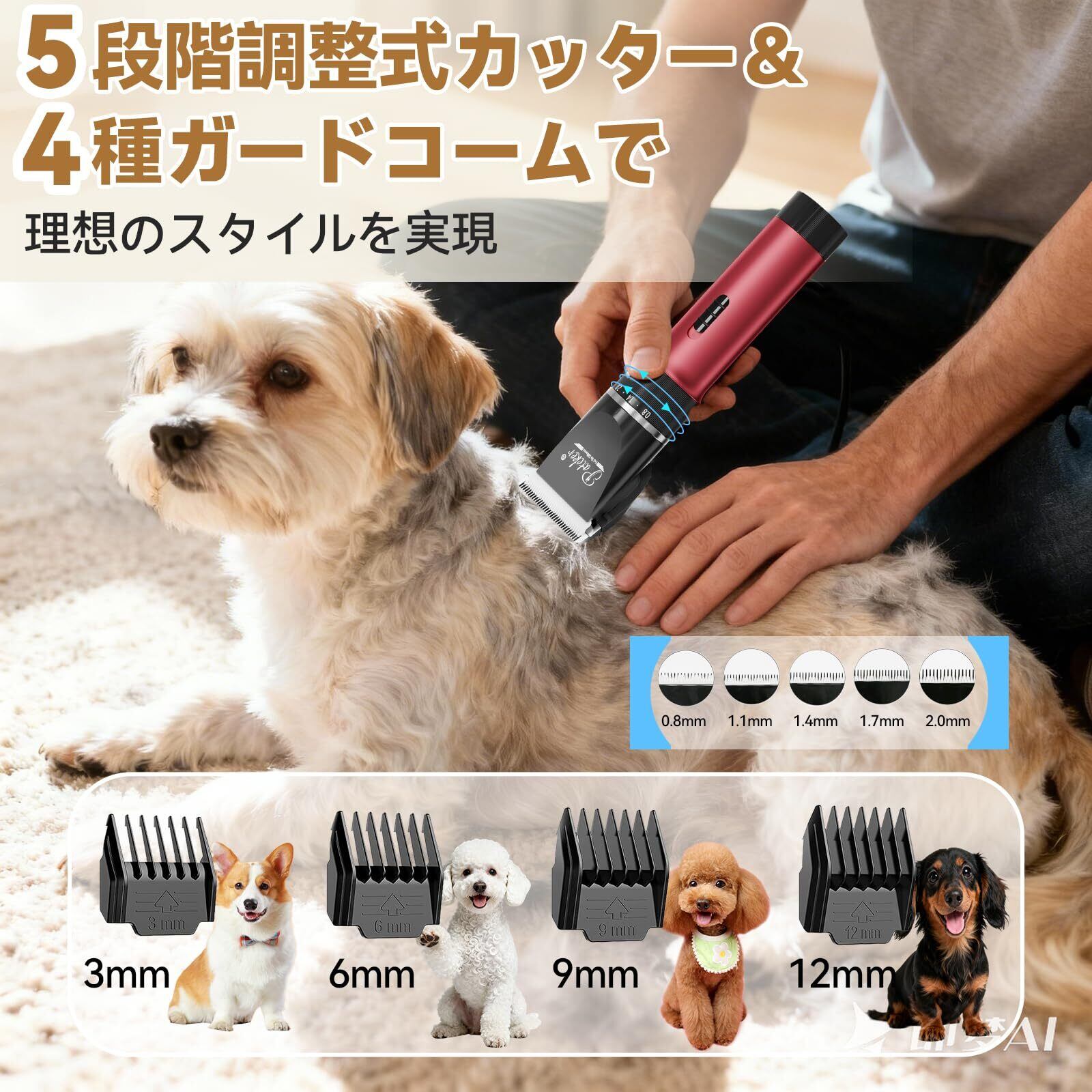 【初心者でも安心&快適なトリミング体験】 高品質チタン刃とセラミック刃を採用し、絡まりやすい毛もスムーズにカット。7600rpmの強力モーターで毛が引っかかる心配も不要。低振 動・低騒音設計により、ペットもリラックスしてトリミングが可能です。初心者の方でも簡単に使え、楽しいグルーミング時間を提供します。