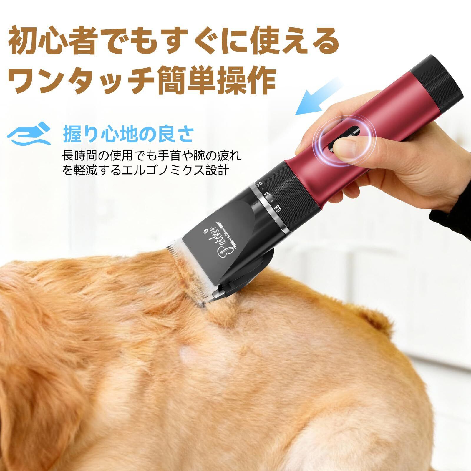 【簡単操作&お手入れラクラク】 軽量コンパクトで人間工学に基づいたデザイン。手にしっかりフィットし、ワンタッチ操作で使いやすい設計です。ブレード部分は水洗い可能で清潔を保てます。初心者からプロまで快適に使える一台で、サロンに行く手間を省き、ペットケアをより簡単に。