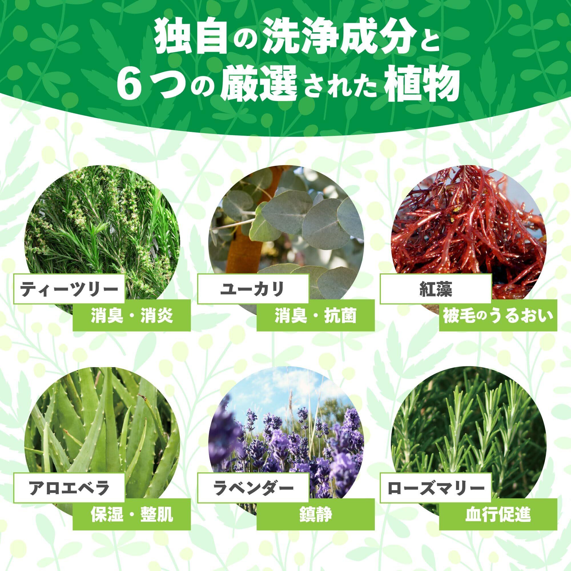 【うるおい効果】独自配合の洗浄成分で皮脂汚れをしっかりと落としクリアな皮膚へ導きます。清浄効果のあるティーツリーをはじめとした6つの植物成分と紅藻エキス&植物性ヒアルロン酸が、被毛をふんわりしなやか、するりとなめらかに仕上げる植物成分配合ナチュラルシャンプーです。泡切れ、水切れがよく、使いやすさも抜群。天然アロエベラが優しく皮膚を保湿し、フケを防止します