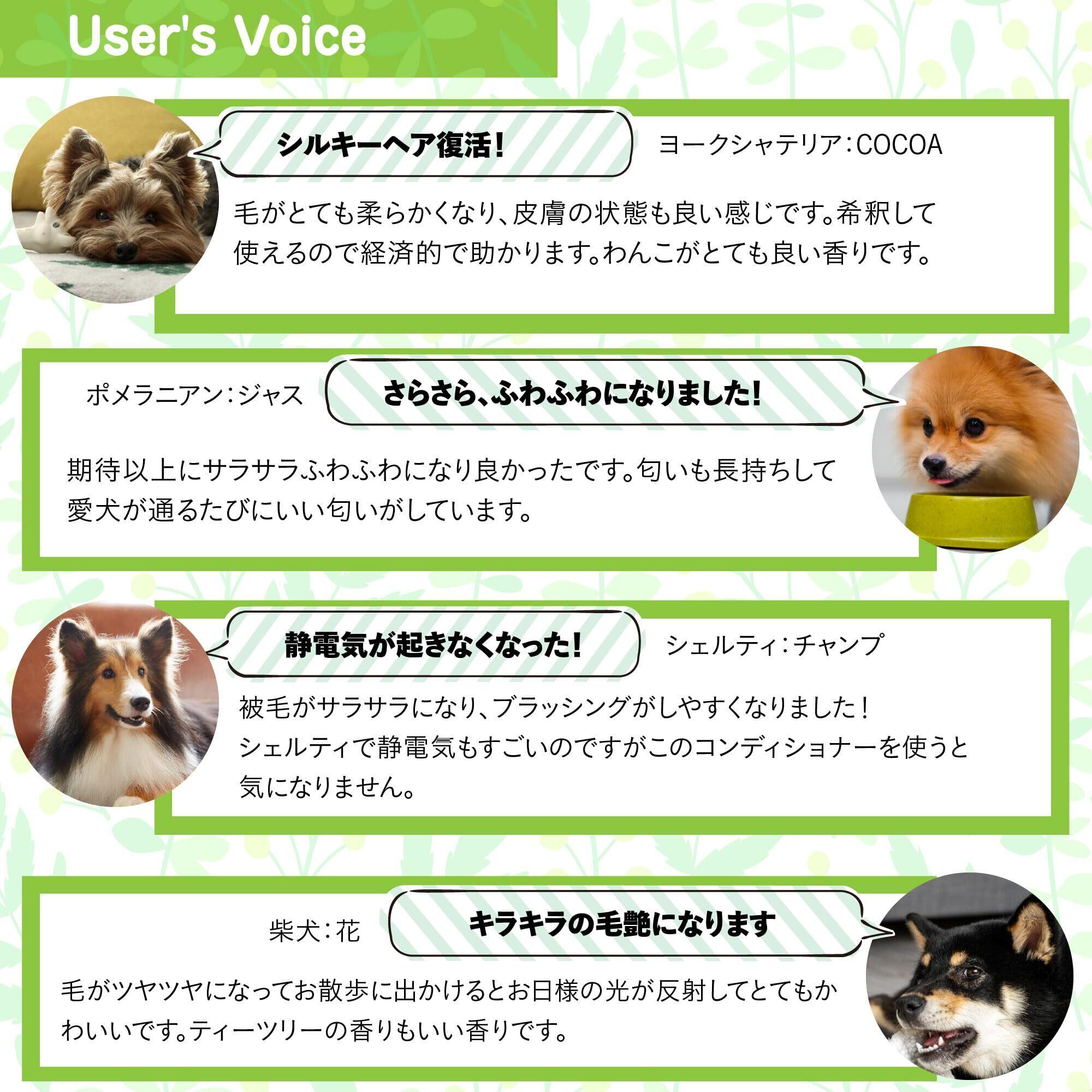 シャンプー後、犬の全身にコンディショナーの原液または2~5倍に薄めたものを適量なじませた後、洗い流してください。