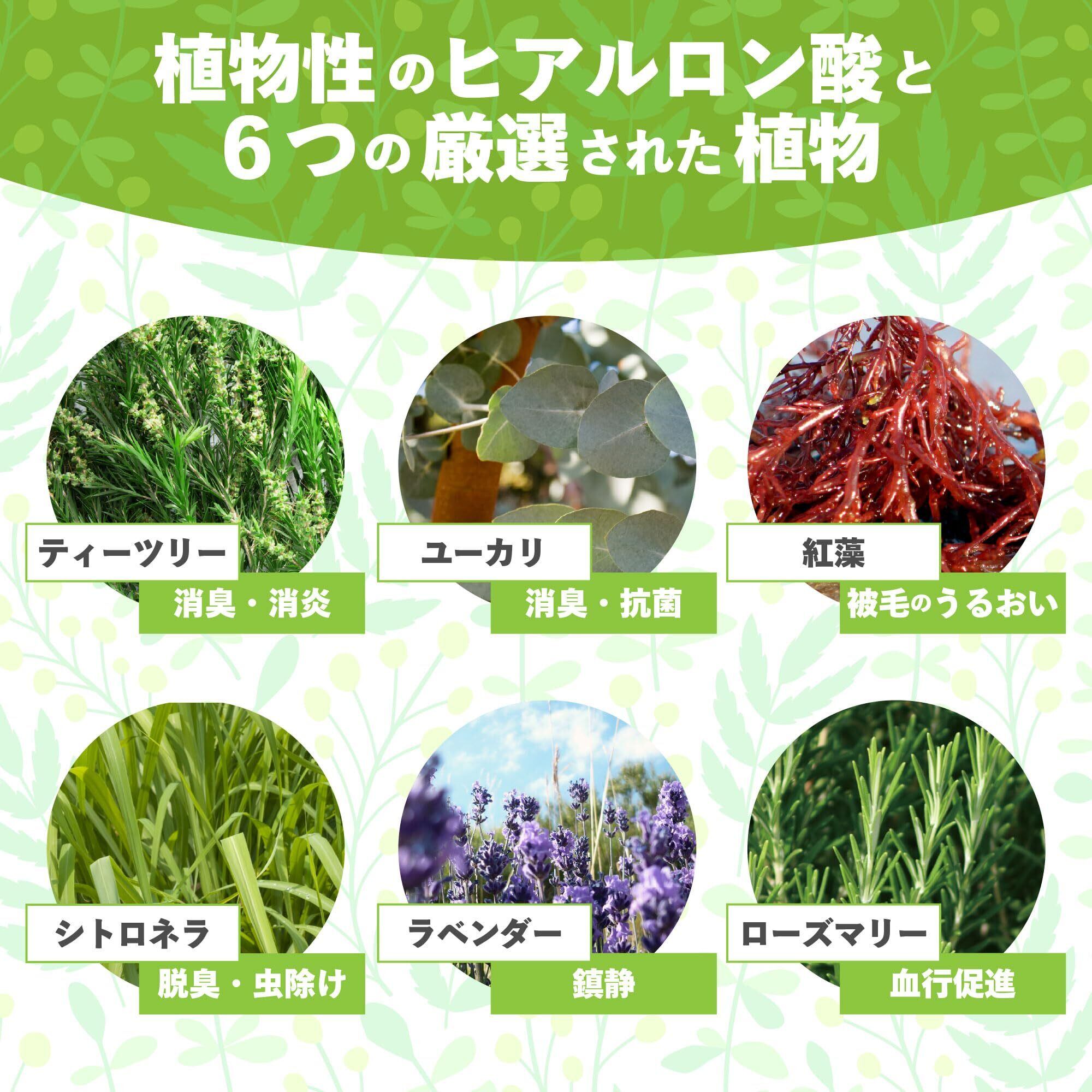 ティーツリーオイル、紅藻エキス、ヒアルロン酸ナトリウム、ユーカリオイル、ローズマリーオイル、ラベンダーオイル、シトロネラオイル、ビタミンE、香料、保存料