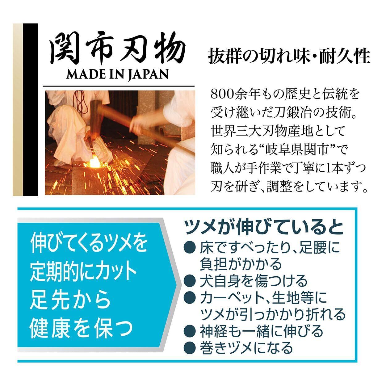 ●関市刃物:世界三大刃物産地として知られる「岐阜県関市」●犬のツメを考えた力が伝わりやすいこだわりの刃先●高硬度ステンレス●犬用半円刃、軽い力でしっかりカット●持ちやすいハンドル:複合樹脂×指置き付●抗菌剤配合