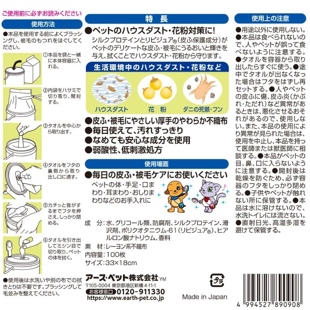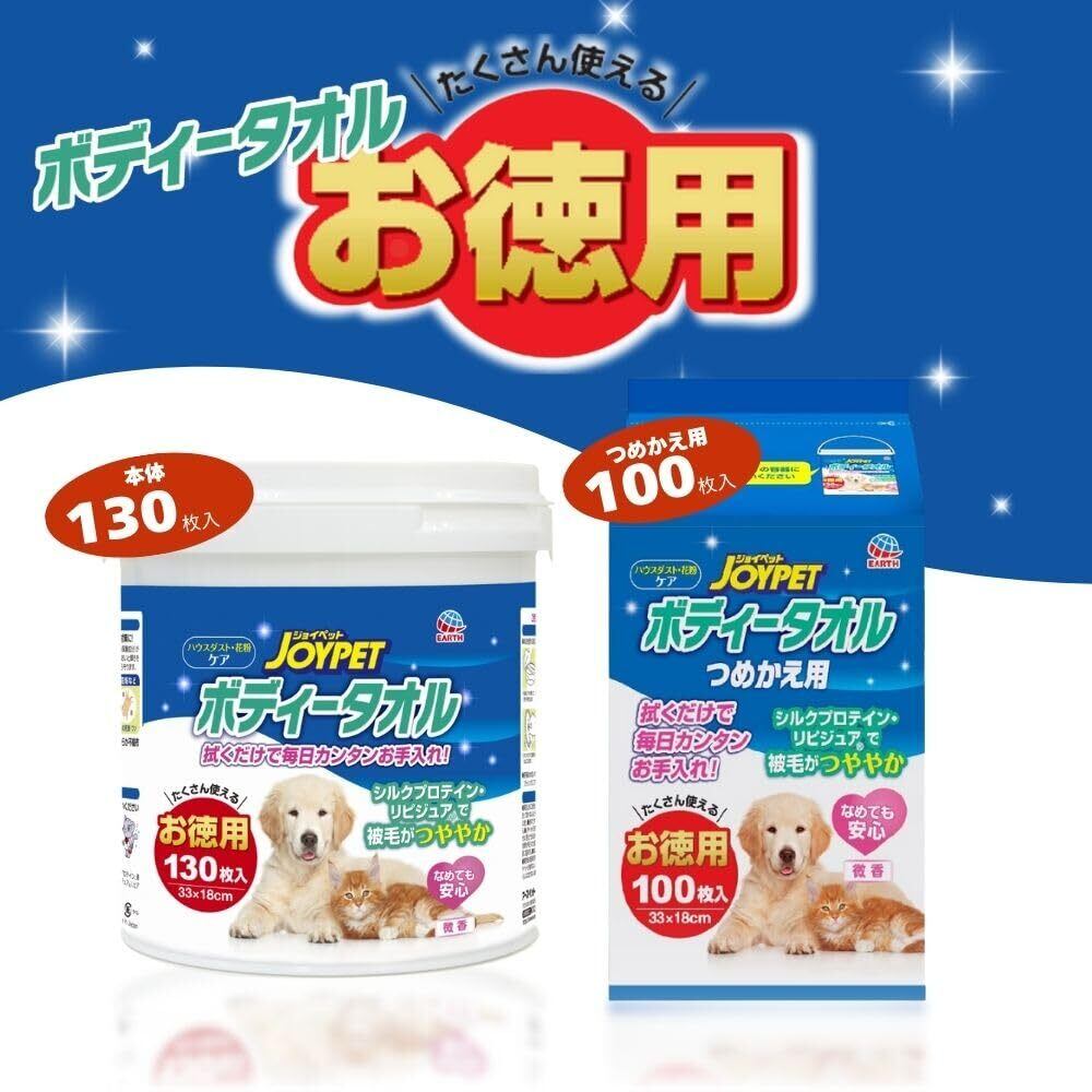 大容量タイプのボディタオルのつめかえ用。シルクプロテインとリピジュアが皮ふ・被毛にうるおいと輝きを与える。やわらかメッシュシート採用。ハウスダスト・花粉対策にも便利。なめても安心。