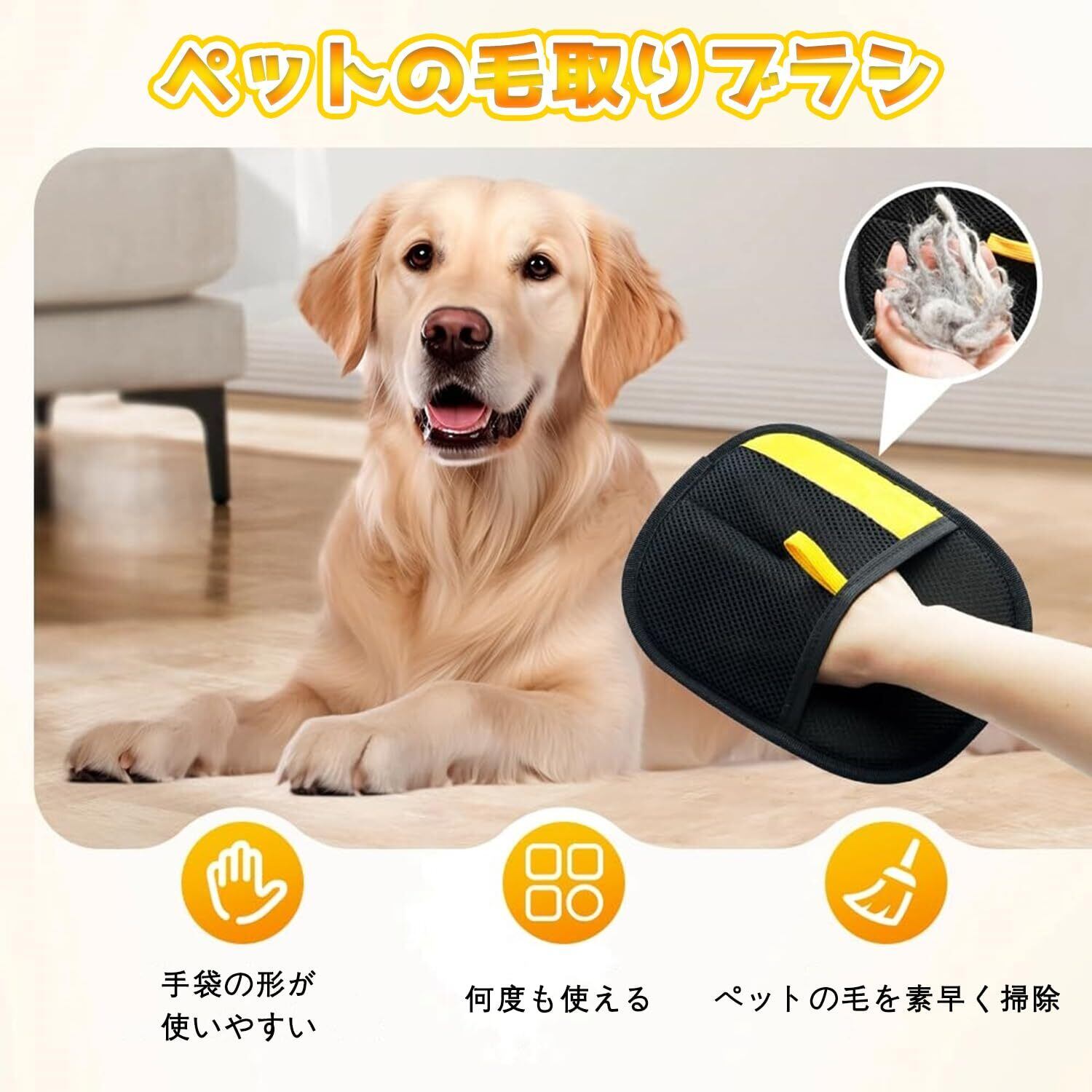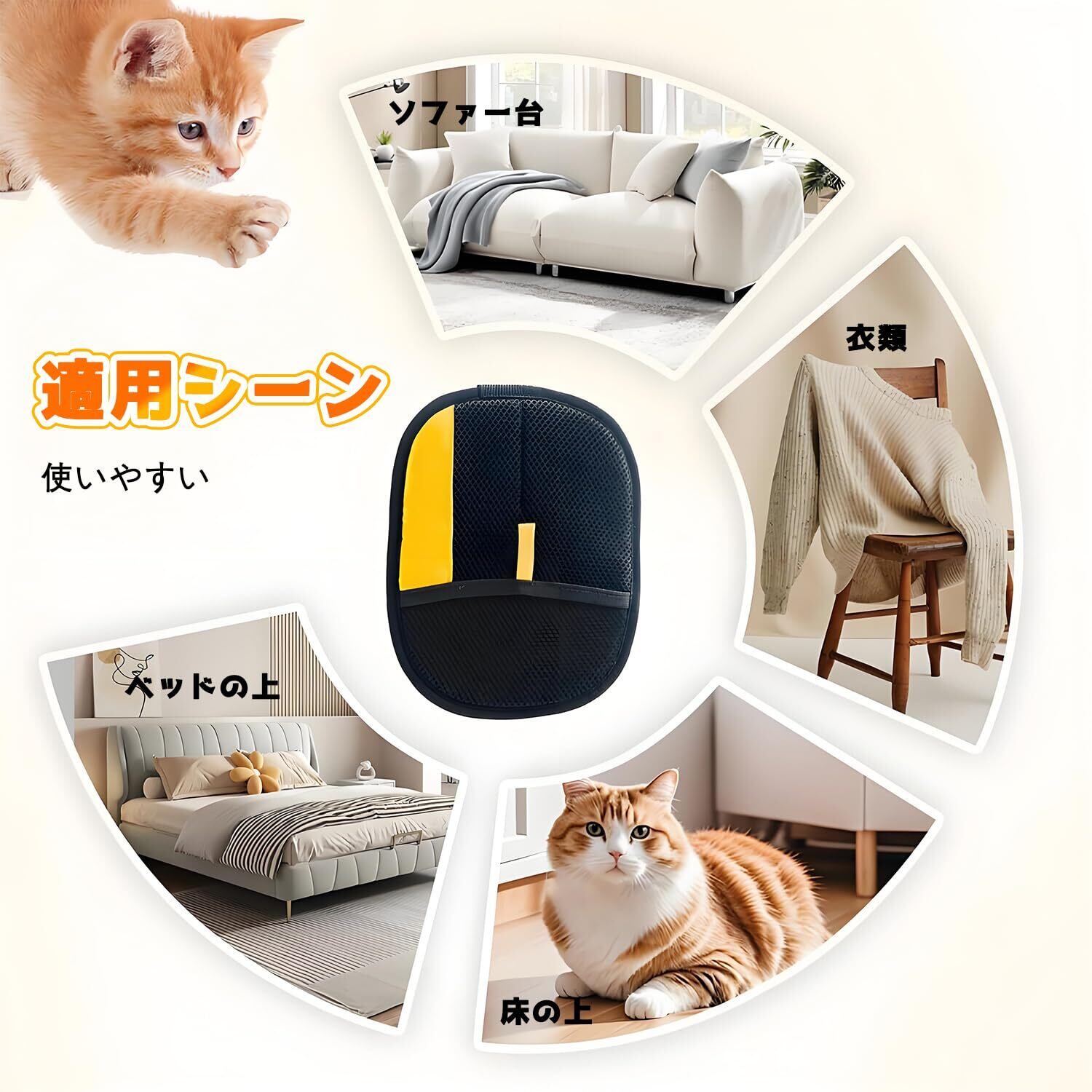 あらゆるシーンで活躍する掃除ツール:この除毛グローブは、ペットだけでなく、床、ソファ、壁、ベッド、手の届きにくい隅など、様々なシーンでお使いいただけます。