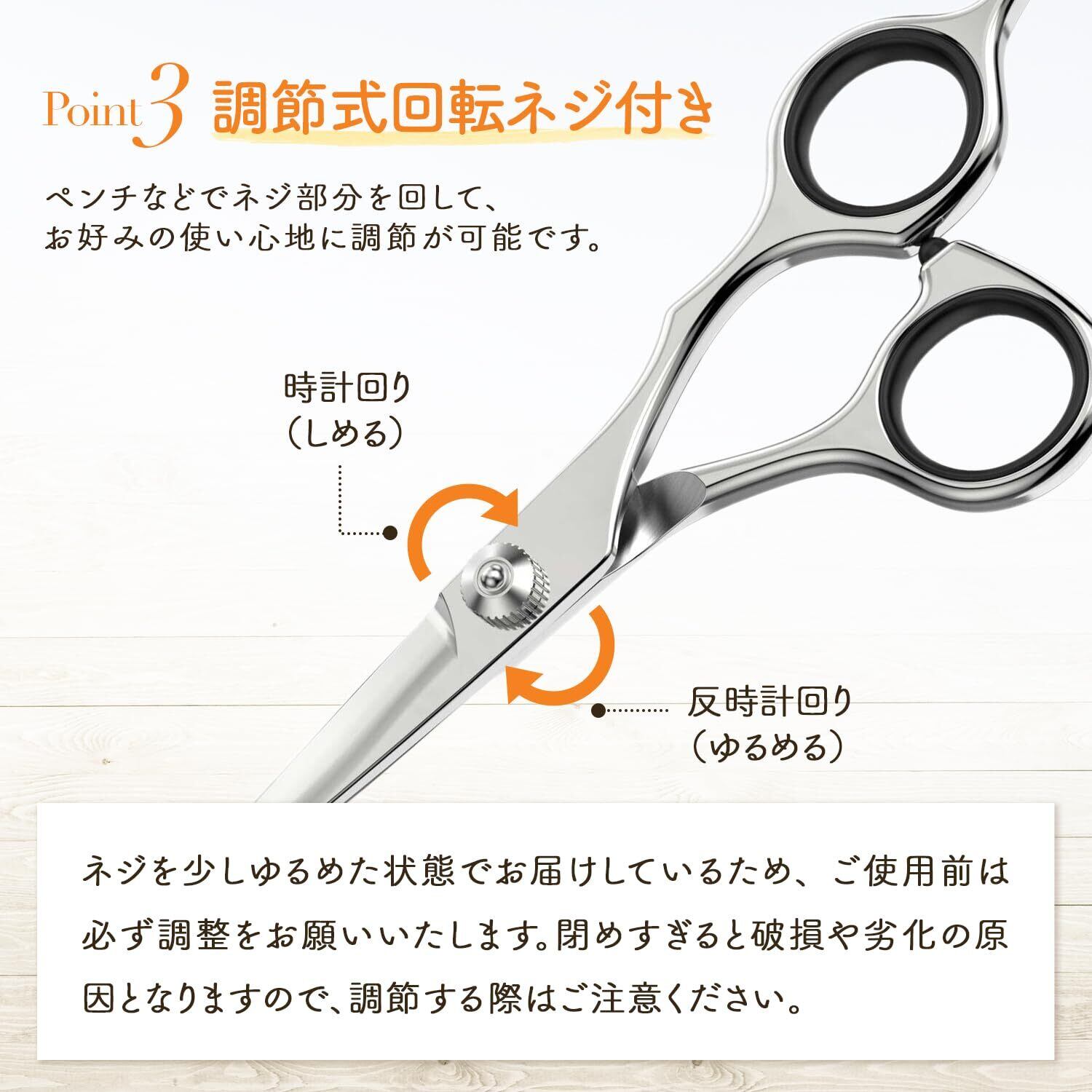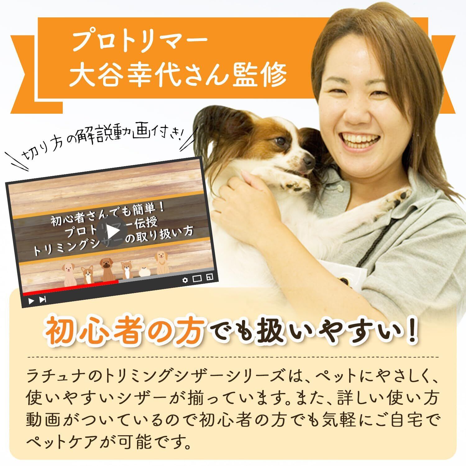 【機能性・安全性】初めてトリミングシザーを取り扱う方にも安心してお使いいただけるように、使いやすさを追求。カット中に急に動いてもケガしにくいよう刃先を丸く設計しました!ハサミ本体には、錆びにくく、切れ味も落ちにくいとされるステンレス素材を採用しております。指を入れる部分には、指リングと衝撃吸収のゴムを配置しており、長時間カットでも手が疲れにくい作りとなっています。また、初心者の方の不安を少しでも取り除けるように持ち方や手入れ方法などを記載した取扱説明書(書付き)や解説動画などもご用意しました。