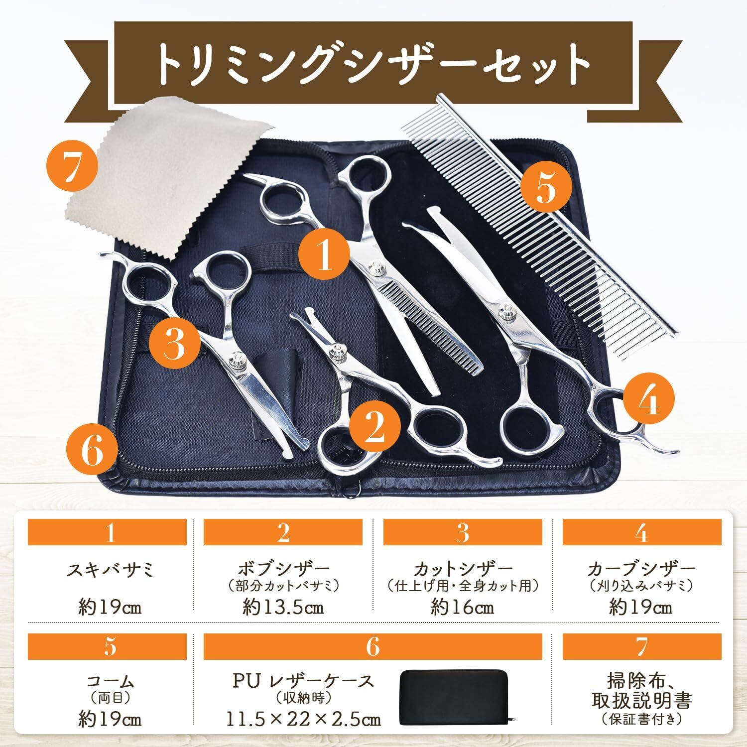 【充実のセット内容】カット初心者にも使いやすいトリミングの7つ道具をセットにしました!/ 1.スキばさみ:毛量を減らしたい、カットラインをぼかしたい時などに使用 / 2.部分カットばさみ:目元やひげ、足裏の毛をカットしたい時などに使用 / 3.全身カットばさみ:全身などの広範囲カット向けで、直線のラインを出したいときやバッサリ切りたいときに使用 / 4.カーブばさみ:頭回りや胴体などに丸みのある可愛いラインを出したい時などに使用 / 5.両目くし:抜け毛・毛玉除去やカット時の毛の流れを整えたい時などに使用 / 6.掃除布:はさみについた毛や汚れを拭き取り清潔を保つのに使用 / 7.PUレザーケース:汚れなどに強いPU素材を使用。持ち運びやトリミング道具の収納に便利!