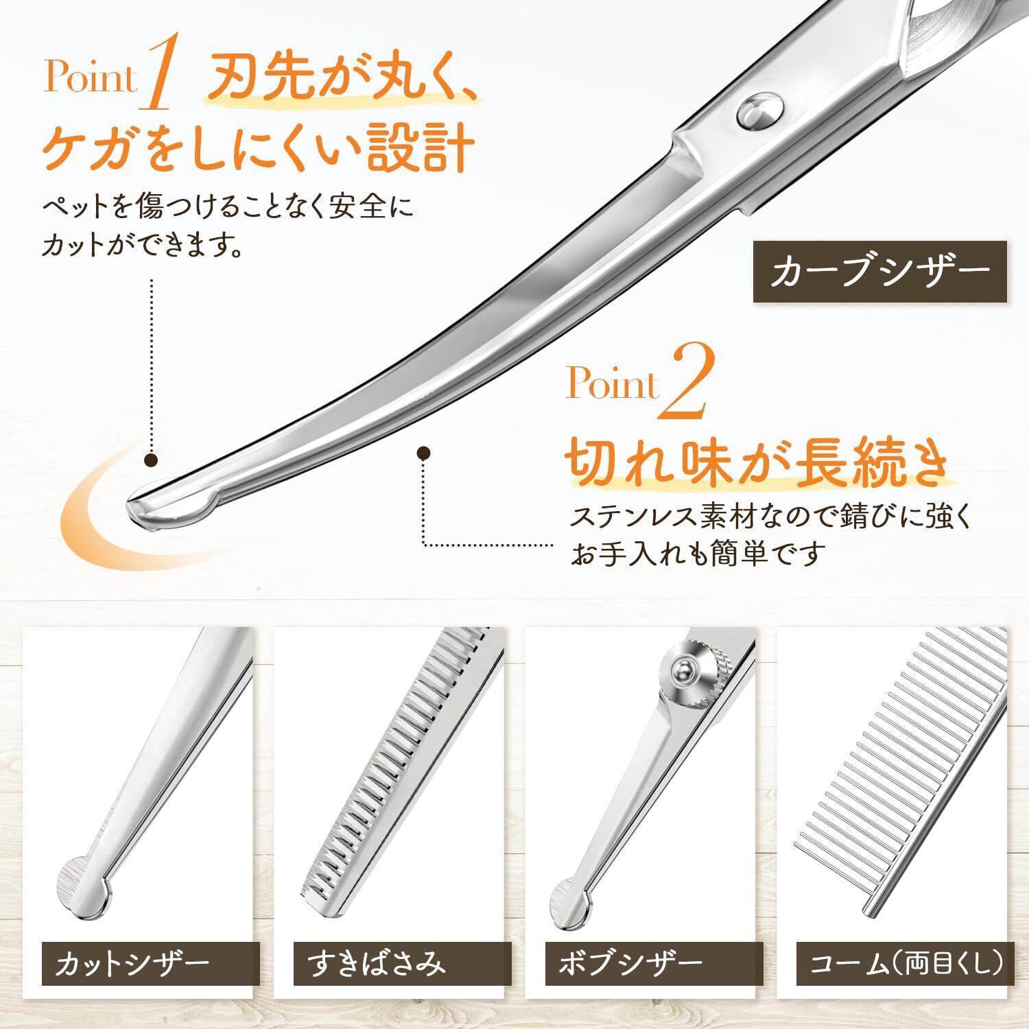 【使用対象】トリミング道具はペットの種類や用途によって使い分けていただくことを推奨しております。●スキばさみは主に、毛量を減らしてすっきり見せる時に使用します。ダックスフンド、パピヨン、キャバリアなどに適しています。●部分カットばさみは、細かい箇所をカットするのに使用します。プードル、シーズー、シュナウザー、ネコちゃん全般、ウサギちゃんなどの小動物などに適しています。●全身カットばさみは、主にワンちゃんの全身や背中をカットしラインを出したいときに使用します。●カーブばさみは、丸みのあるカットラインに仕上げたいときに使用します。主にプードル、シーズー、マルチーズなどに適しています。●くしは全犬、猫、小動物に使用可能です。
