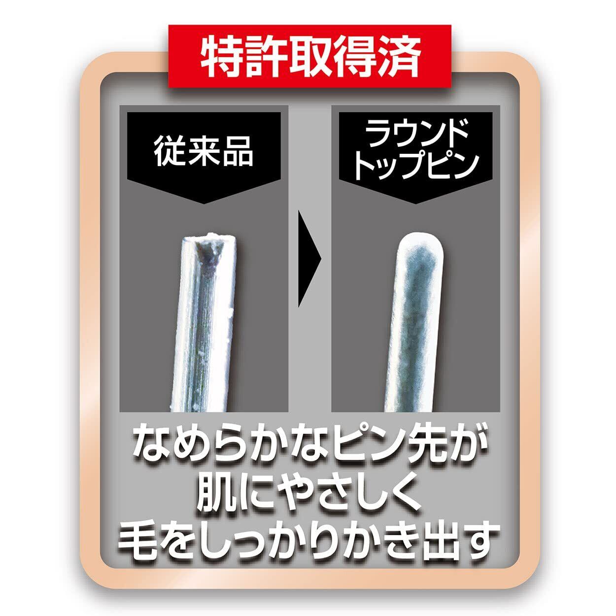 技術でピンの先端が丸く加工されており、皮膚を傷つける事なく、効率よく整毛とムダ毛の除去がおこなえます。ピンには国産ステンレスSUS304を使用。