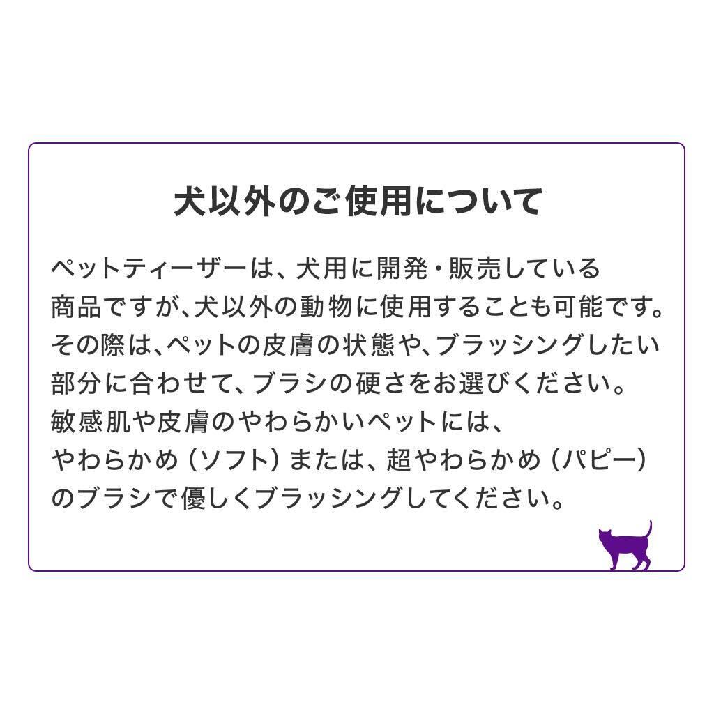 ペットティーザーは、犬用に開発・販売している商品ですが、犬以外の動物に使用することも可能です。 その際は、ペットの皮膚の状態や、ブラッシングしたい部分に合わせて、ブラシの硬さをお選びください。 敏感肌や皮膚のやわらかいペットには、やわらかめ(ソフト)または、超やわらかめ(パピー)のブラシで優しくブラッシングしてください。