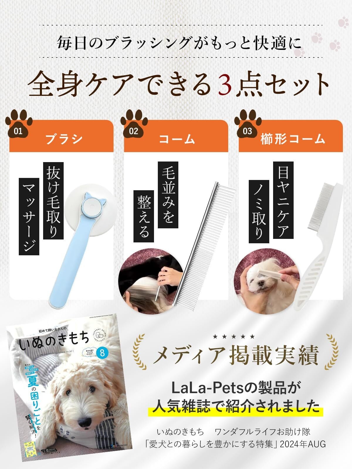 【JPPMA認定品×トリマー専門学校講師監修】『毛並み美人』犬猫用スリッカーブラシ&2種コームセット | お手入れ講座付き | ワンプッシュ式・毛玉取り・抜け毛ケア・痛くないペットブラシ|LaLa-Pets (白×グレー)