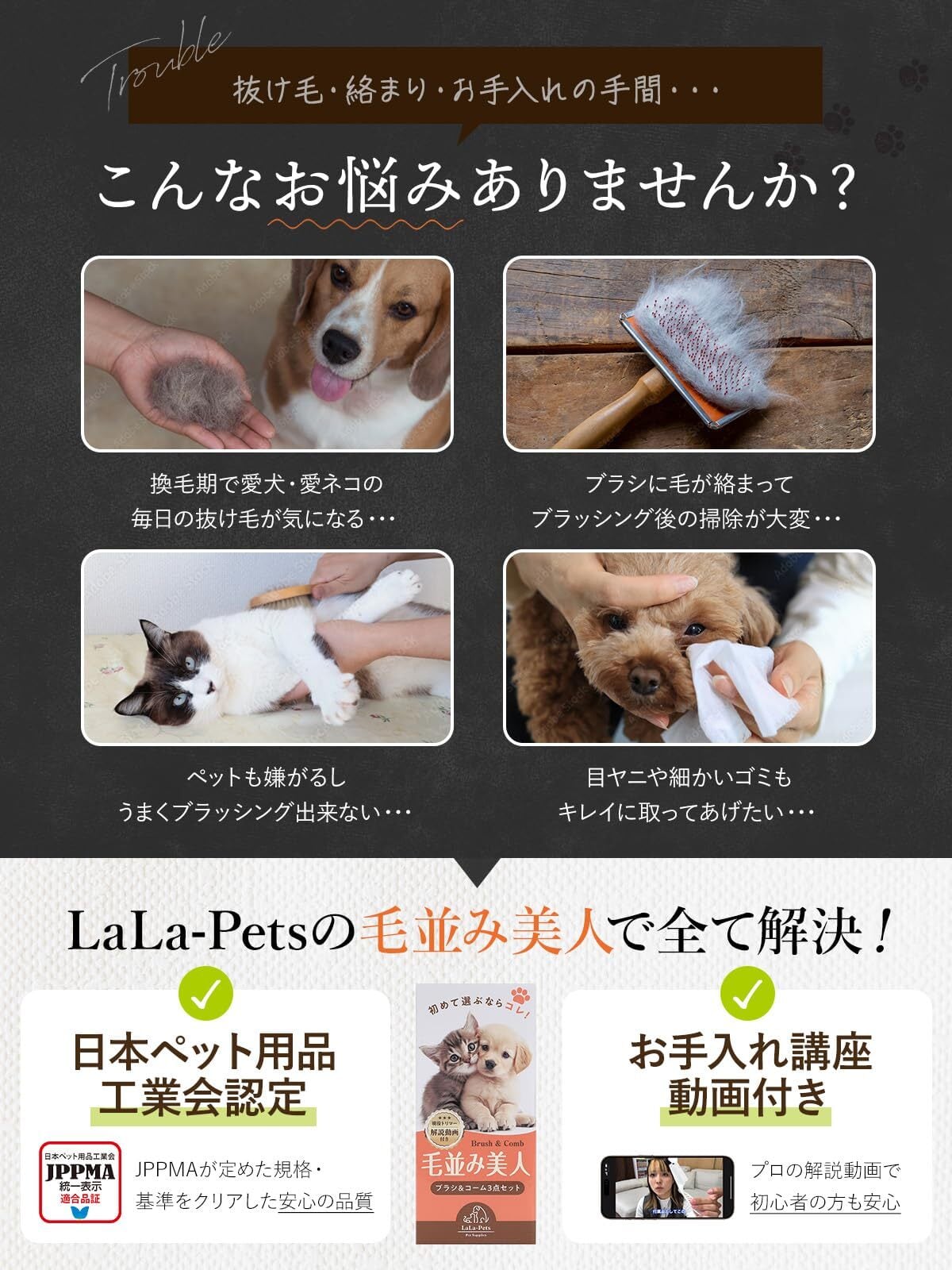 【お手入れ講座付き&品質】 初めてのブラッシングでも安心! プロの講師による丁寧な解説動画付きで正しいブラッシング方法が学べる!やりがちな失敗やポイントなどをしっかり学習し、ペットに快適なブラッシングを。『毛並み美人』であなたのペットを もっと可愛く、より愛らしく。