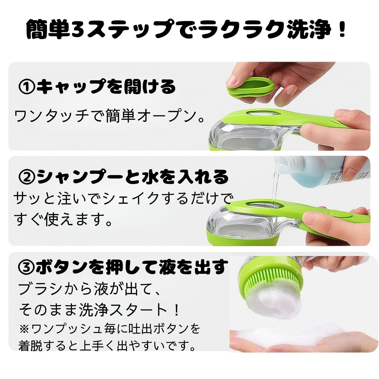「製品概要」:シャンプーと泡立て器の機能を兼ね備えた便利なグルーミングアイテムです。ブラシ部分から液が出る設計で、愛犬の毛にしっかりとシャンプーを行き渡らせながら、やさしくマッサージ。自宅で簡単に、サロン級のシャンプー体験を実現します。
