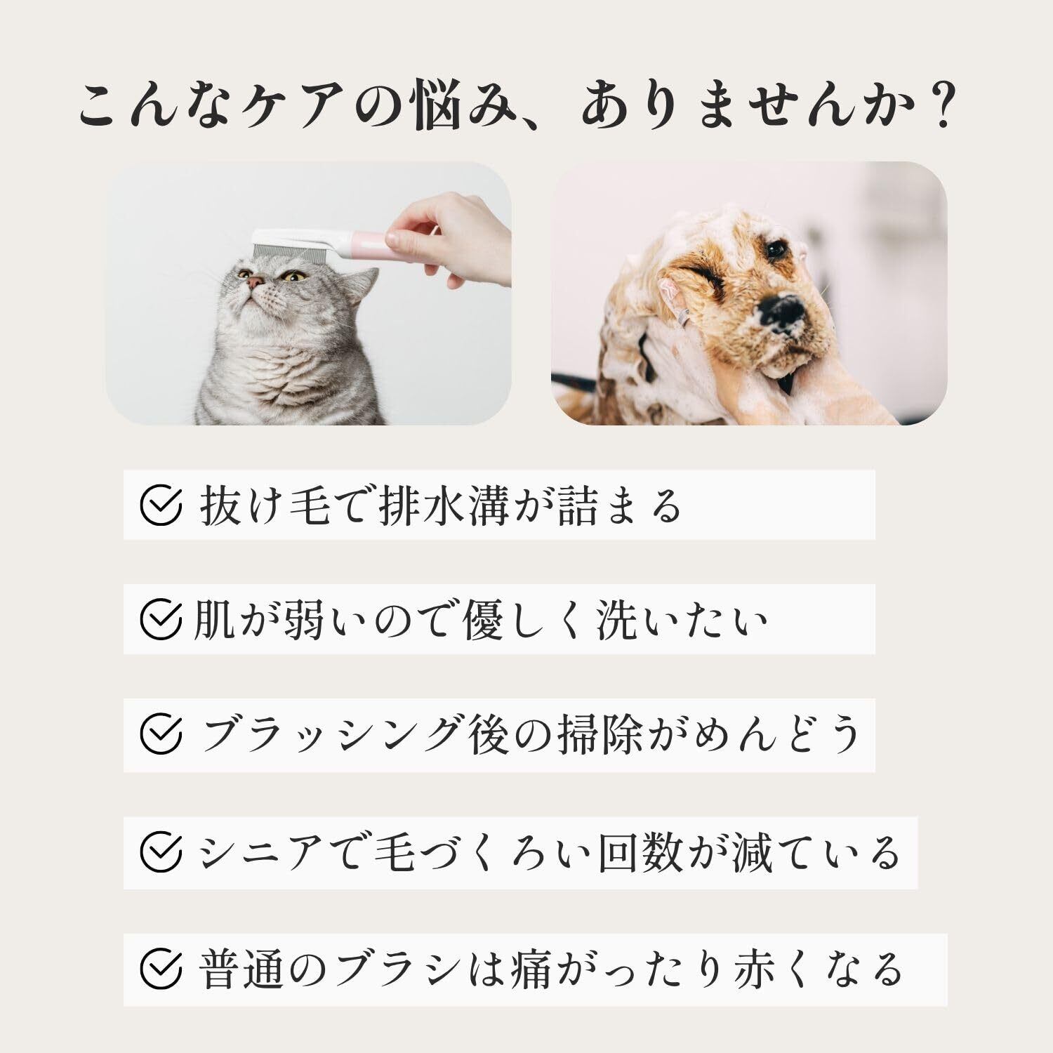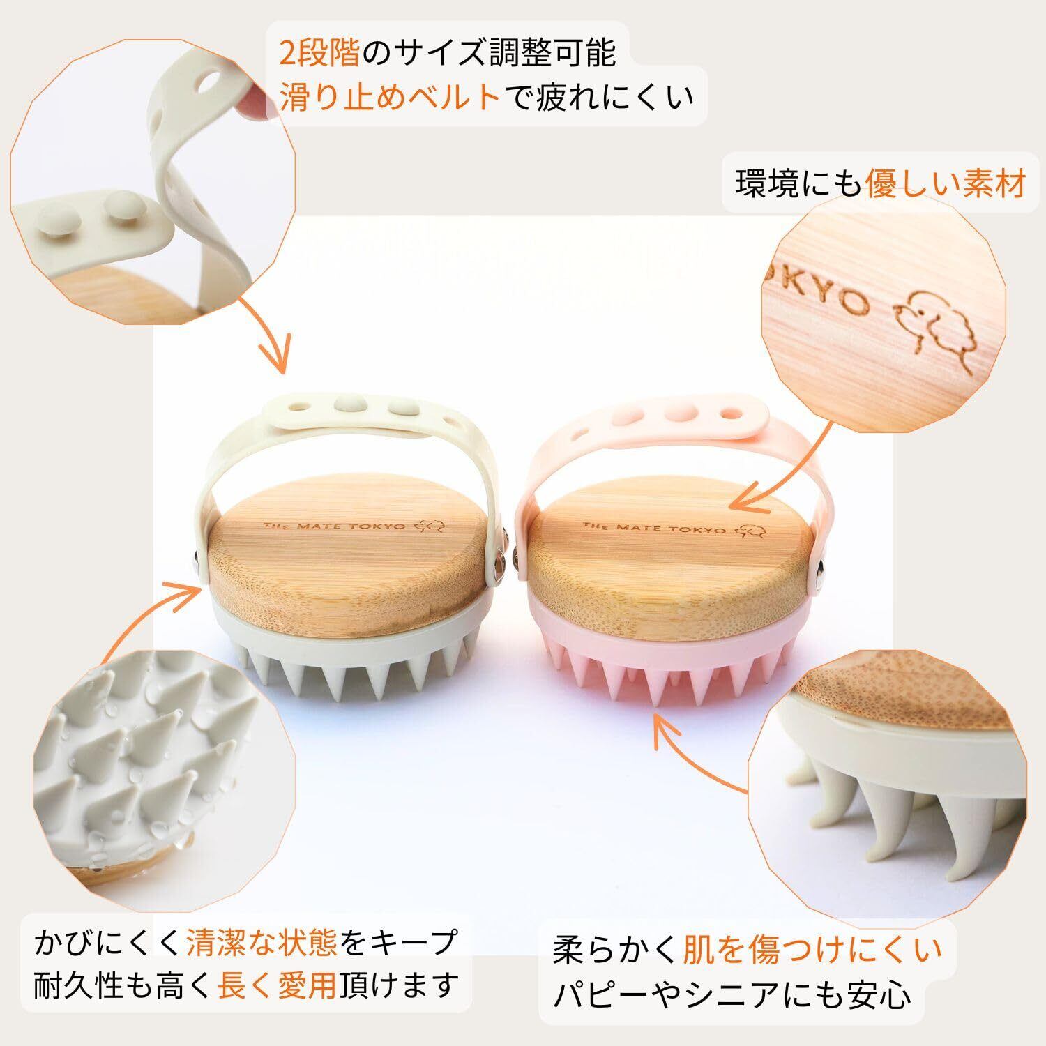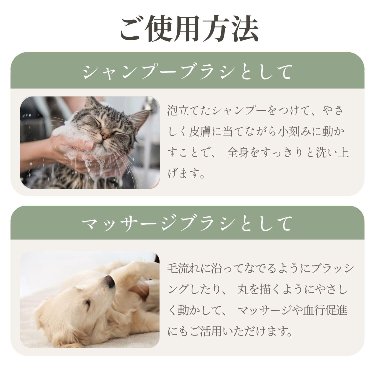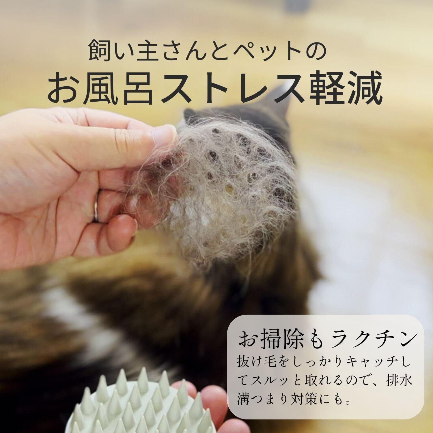 【インバス&アウトバス両用|濡れた状態でも乾いた状態でも使える】 お風呂(インバス)でシャンプーを泡立てながら使用できるだけでなく、乾いた状態(アウトバス)でのマッサージや抜け毛取りにも使える2WAYタイプ。 日々のお手入れや換毛期のケアにも便利です。