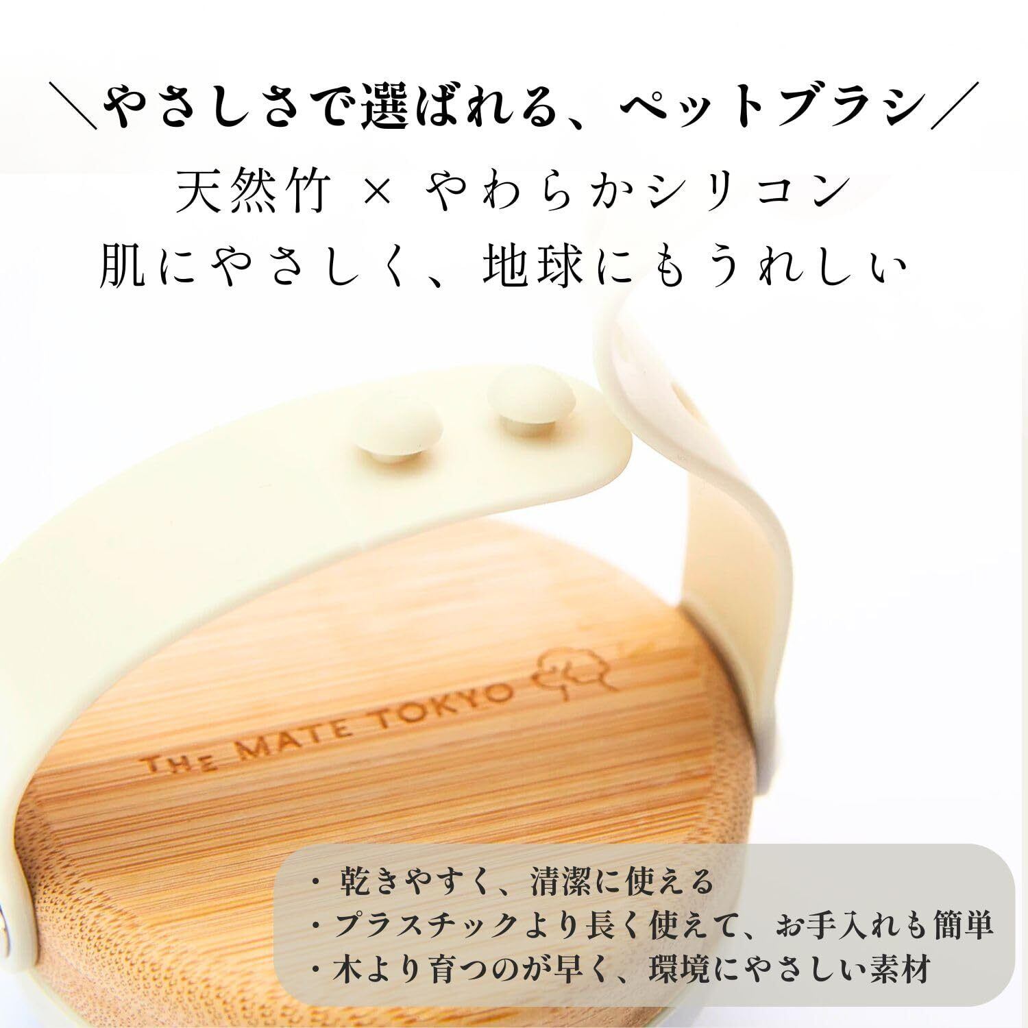 【竹製ハンドル&やさしいシリコン素材で安心の使い心地】 環境にやさしい天然の竹素材を使用したハンドルは、見た目も上品で軽く、手になじむ設計です。 先端はやわらかいシリコンブラシで、デリケートなペットの皮膚にもやさしく使えます。毎日のケアにも安心してご利用いただけます。