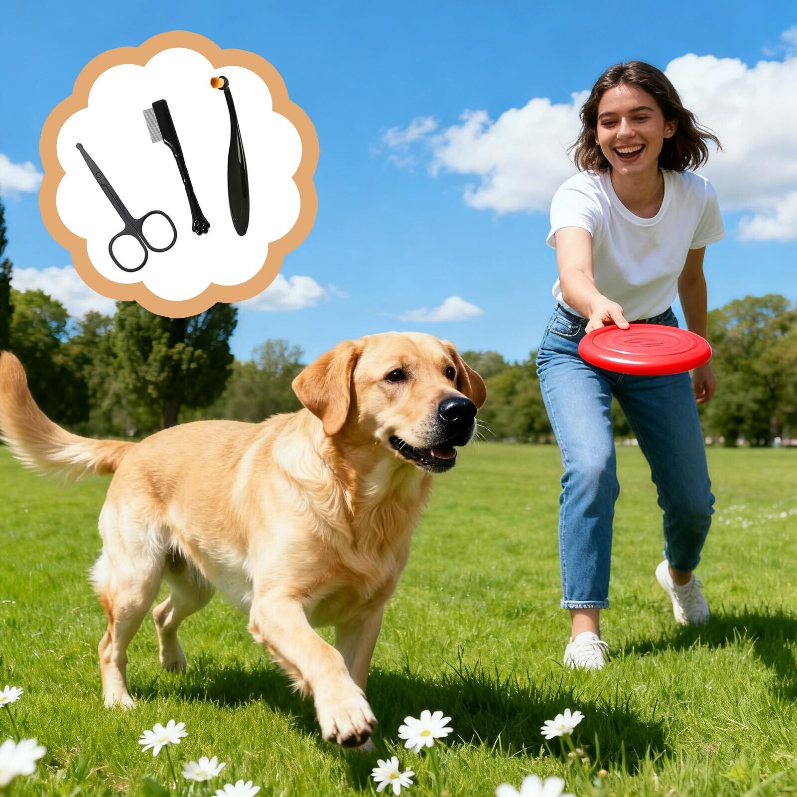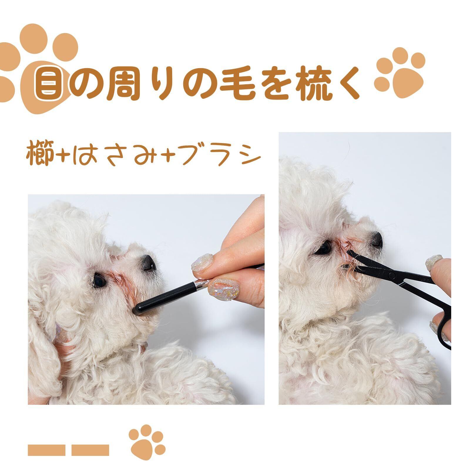 【使用シーン】:櫛でペットの目の周りの汚れを取り除き、ハサミで雑毛をカットし、涙の跡をきれいにしてブラシで目の周りに残った液体を軽く揉む。
