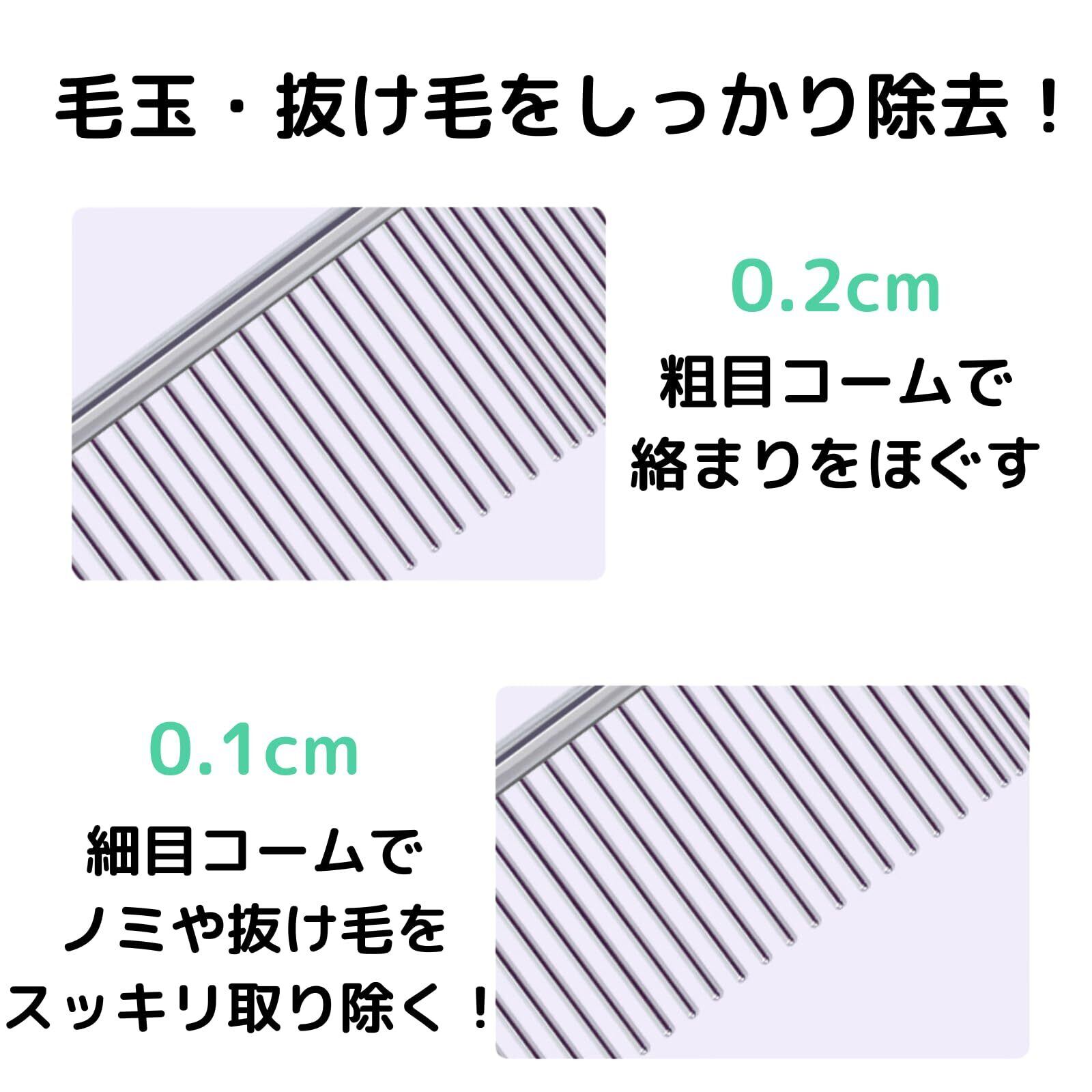 【毛玉&抜け毛対策】粗目コームは絡まった毛をほぐしやすく、細目コームはノミやダニ・抜け毛の除去に最適。
