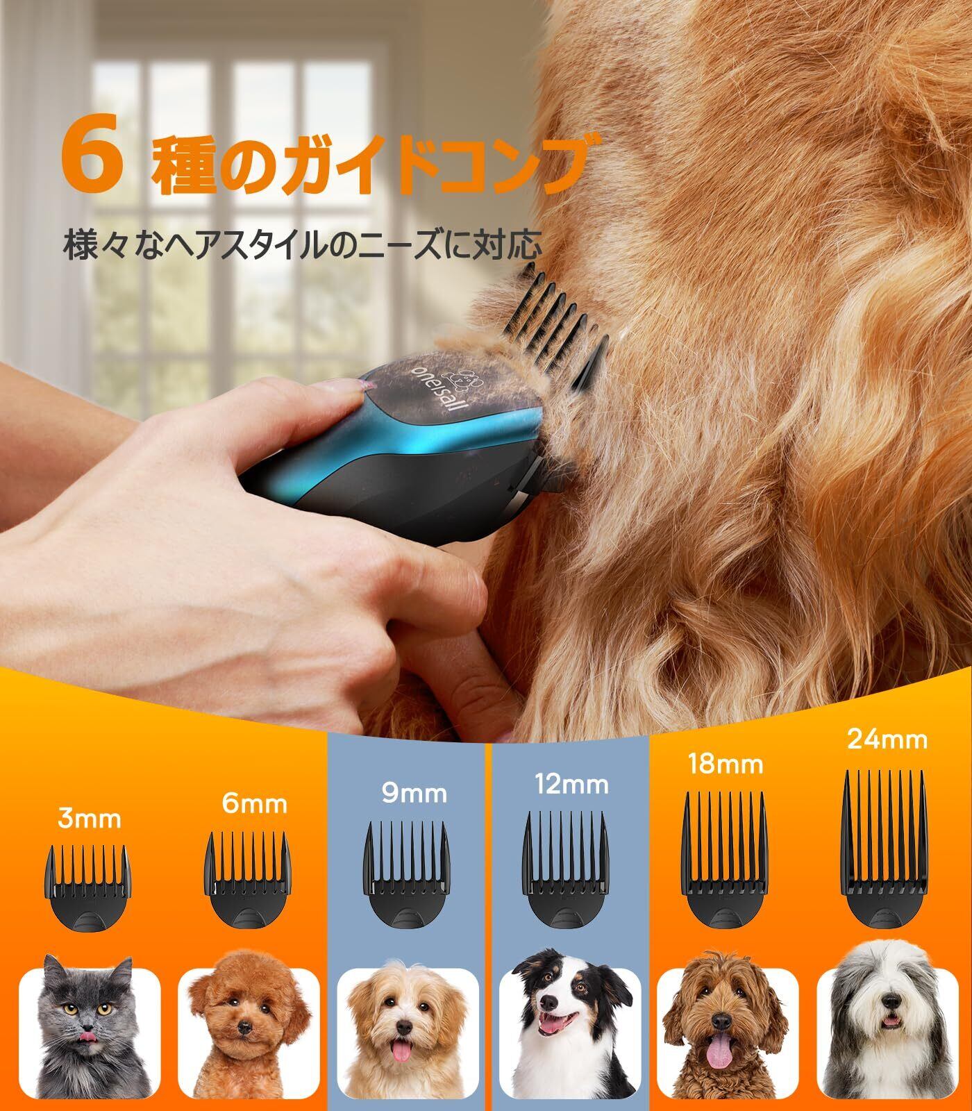 【セット内容】厚い被毛のトリミング用ペット バリカンには、6つのガイドコーム(3mm/6mm/9mm/12mm/18mm/24mm)、クリーニングブラシ、USBケーブル、日本語取扱説明書が付属しています。犬の被毛をトリミングするために必要な部品が揃っていて、ペットの飼い主に最適な贈り物でしょう。
