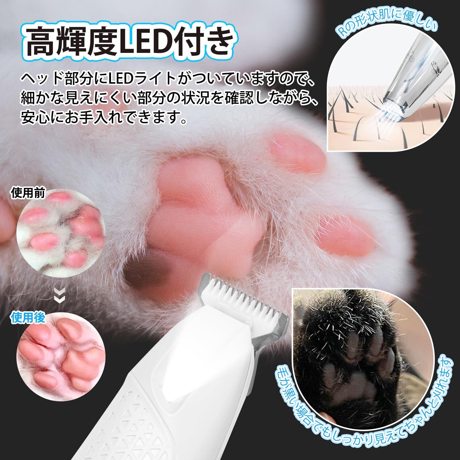 【安全デザインを採用し、ペットの肌を傷つけない】 吸引式バリカンに付属する高精度 LED ライトは、肉球周りや耳道内側などの視界不良な部分を明るく照らし、正確なトリミングを可能にするとともに、ペットの肌を傷つけるリスクを低減します。同時に 48 デシベル以下の静音デザインを採用しているため、音に敏感なペットも怖がることはありません。