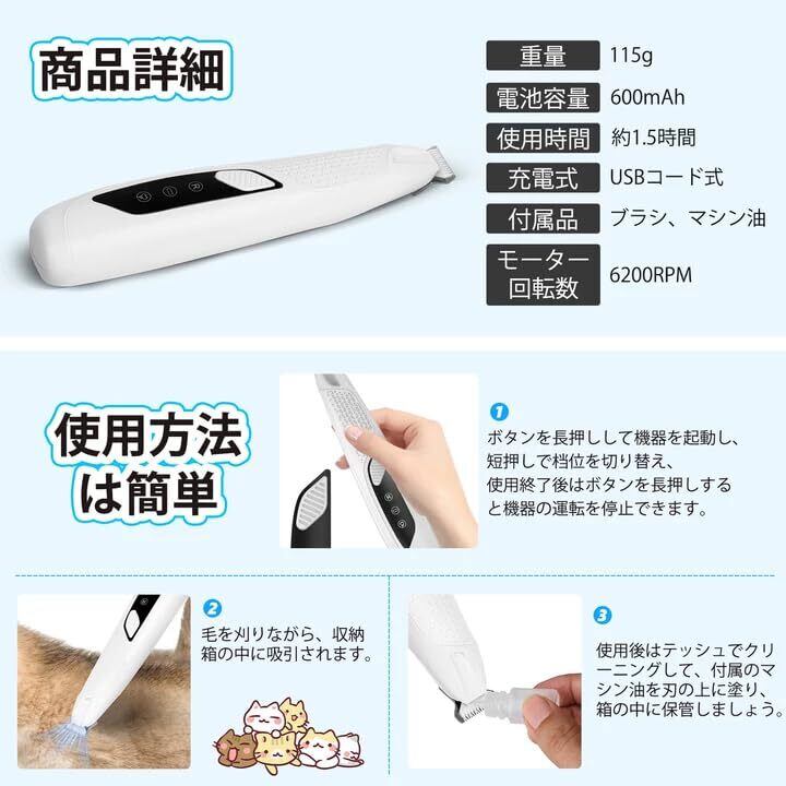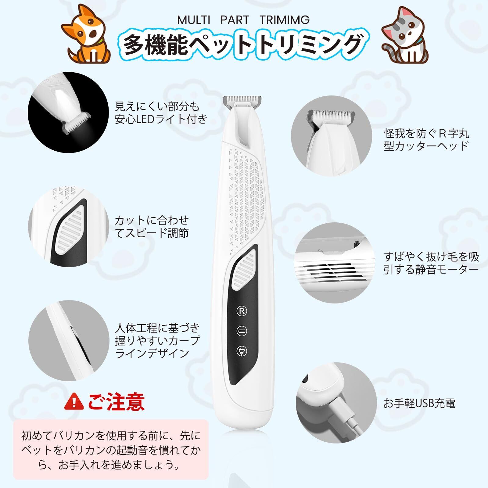 Candykenny ペットバリカン 犬バリカン 吸引式 足裏 顔周り 肉球 猫トリミング 2段階調整可能 部分カット 充電式 自宅 コードレス 軽量静音 低振動 初心者 長毛 小動物に対応