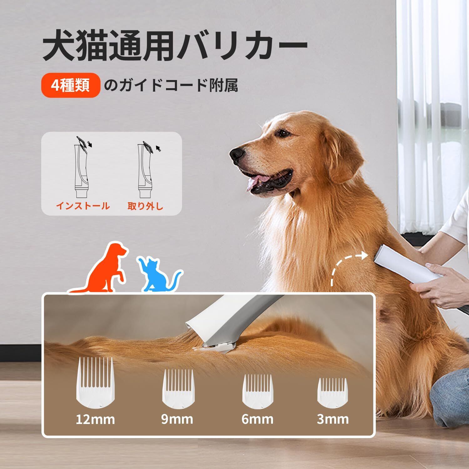【豊富なアタッチメント】電動バリカン、抜け毛ブラシ、清掃ブラシ、グルーミングブラシ、円形ブローノズルと幅広ブローノズル、吸引ノズルがセットに含まれています。ペットの毛をブラッシングするだけで、ペットの抜け毛、浮いた毛を約99%除去することができます。 電動バリカンに合わせて、3mm、6mm、9mm、12mmという4種類のガイドコームが付き、需要に応じてご自由に選んで利用することができます。(初めて使用する場合は第1段階から始めることをお勧めします。ペットが操作の音に慣れないよう驚かせることを防ぐため)
