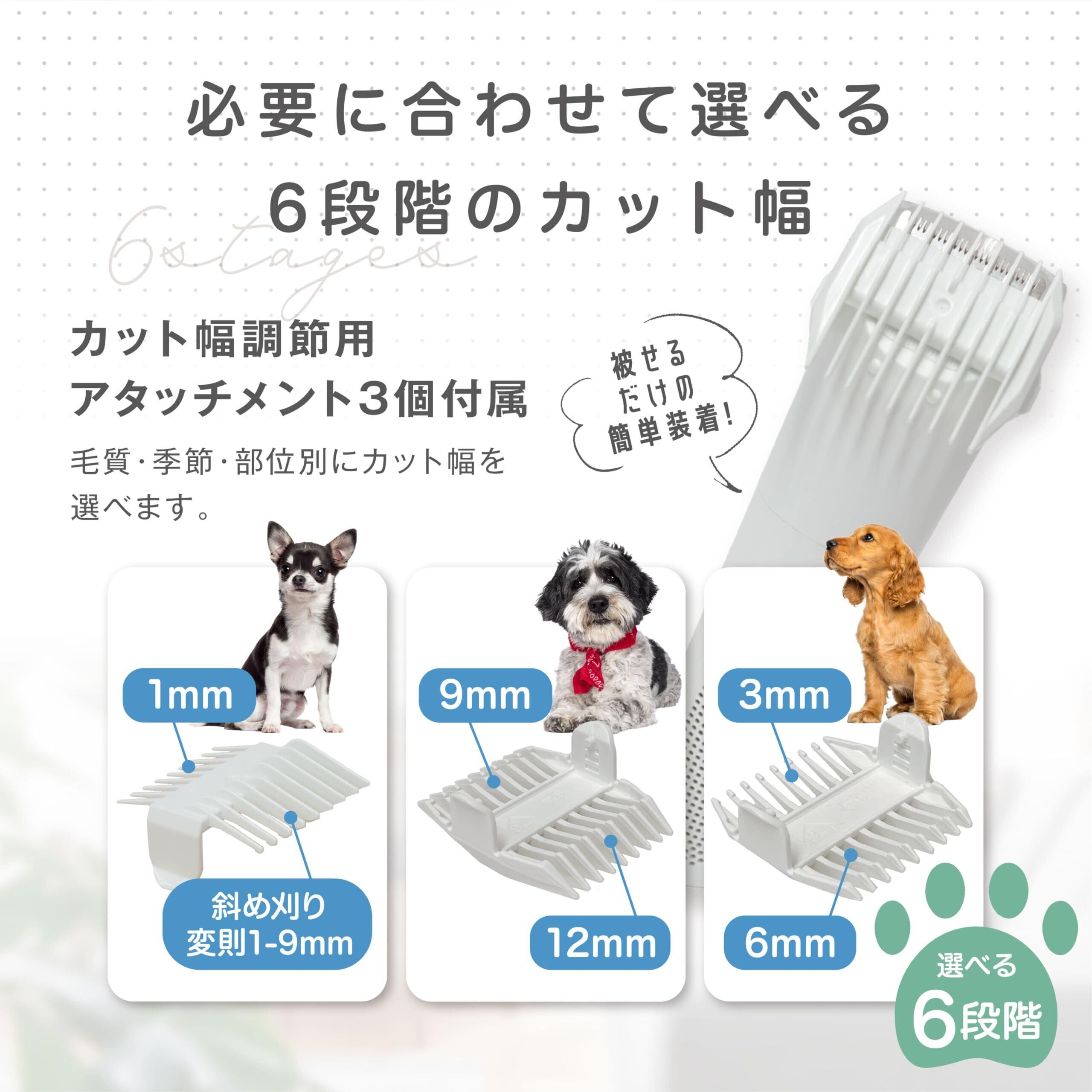 ペットの長さに合わせる様々なアタッチメント:3/6mm,9/12mm,1mm/斜め刈り変則1-9mm