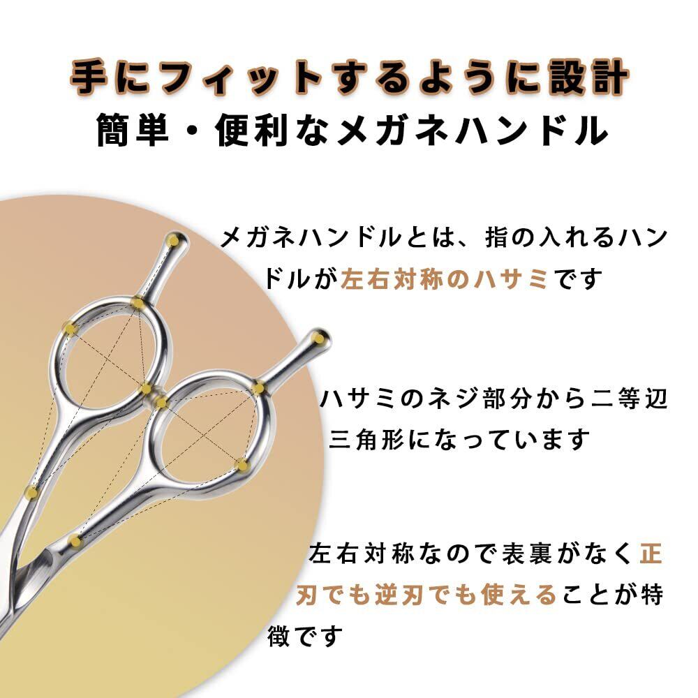 【正刃・逆刃両用カーブシザー】ハサミのハンドルは正刃・逆刃両用リバーシブルメガネ。顔周リ/足回リ/ボデイラインなど 部位によって向きを変えられます。