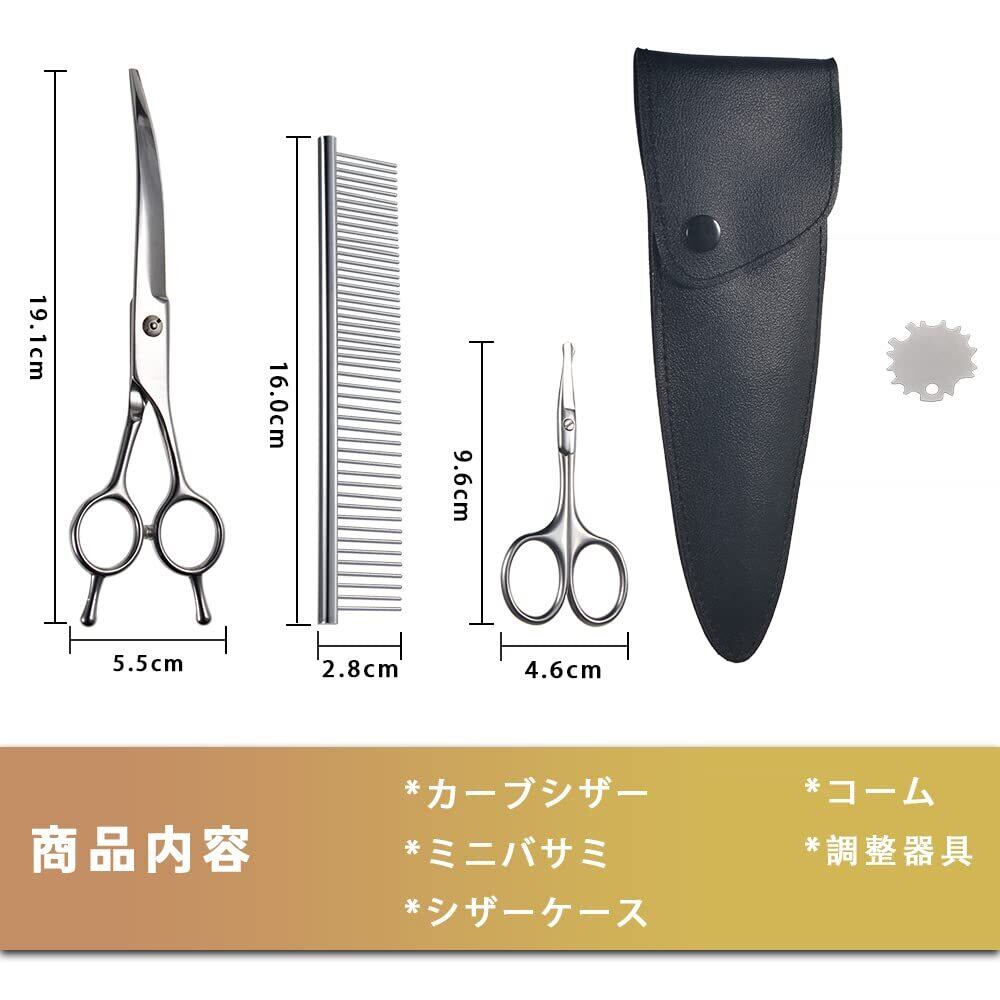 【ハサミケース付き】シンプルなPU革収納ケースにちゃんと収めてくれて保管や持ち運びにも便利な犬トリミングハサミ。商品内容:カーブシザー、ミニカットシザー、シザーケース、コーム、ネジ調整器具