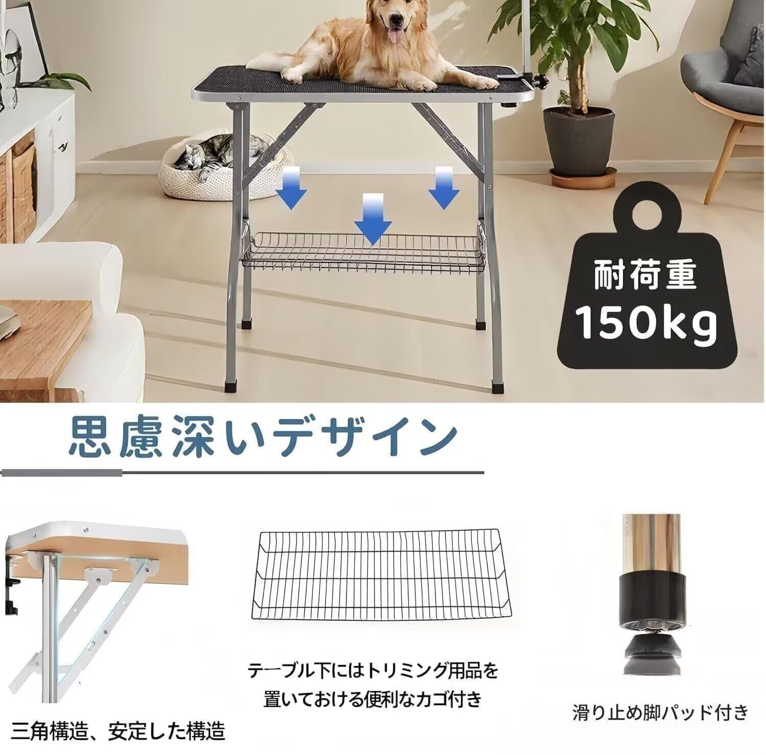 【思慮深いデザイン】テーブル下にはトリミング用品を置いておける便利なカゴ付き。調節可能な脚部、凹凸のある地面にも対応しやすく、脱着可能なアームで好きな場所にアームを設置可能です。リード紐付です。
