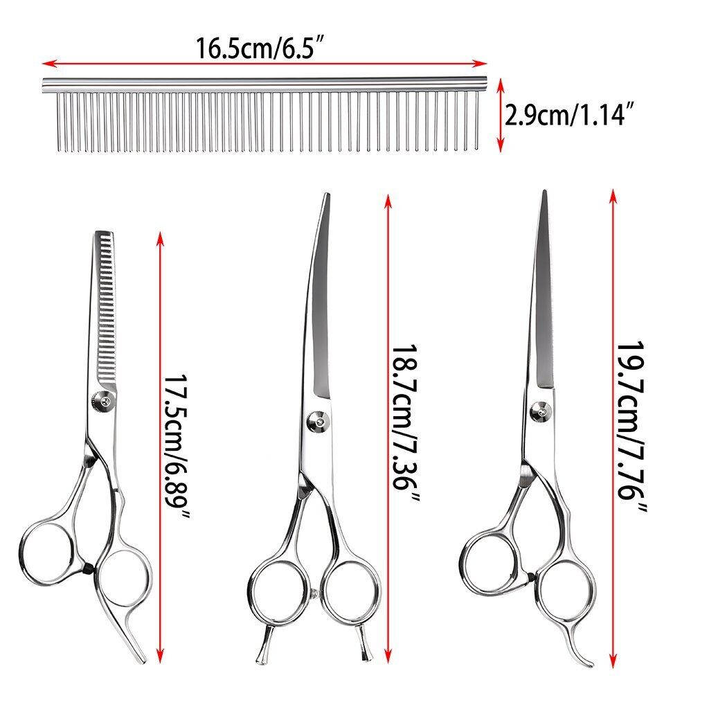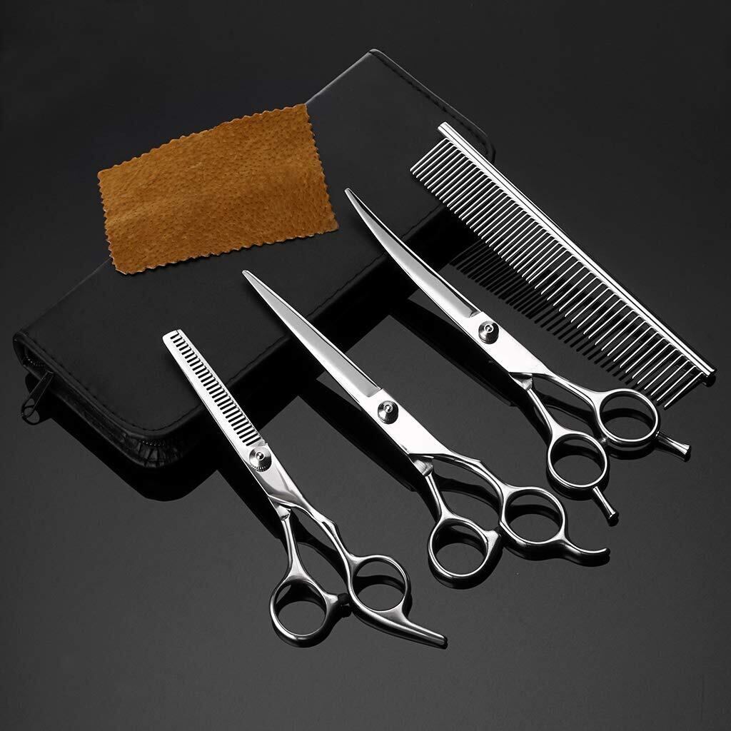 【セット内容】レギュラーシザー、セニングシザー(スキバサミ)、カーブシザー(上向き)、グルーミング櫛、掃除用クロス、収納ケース(黒)