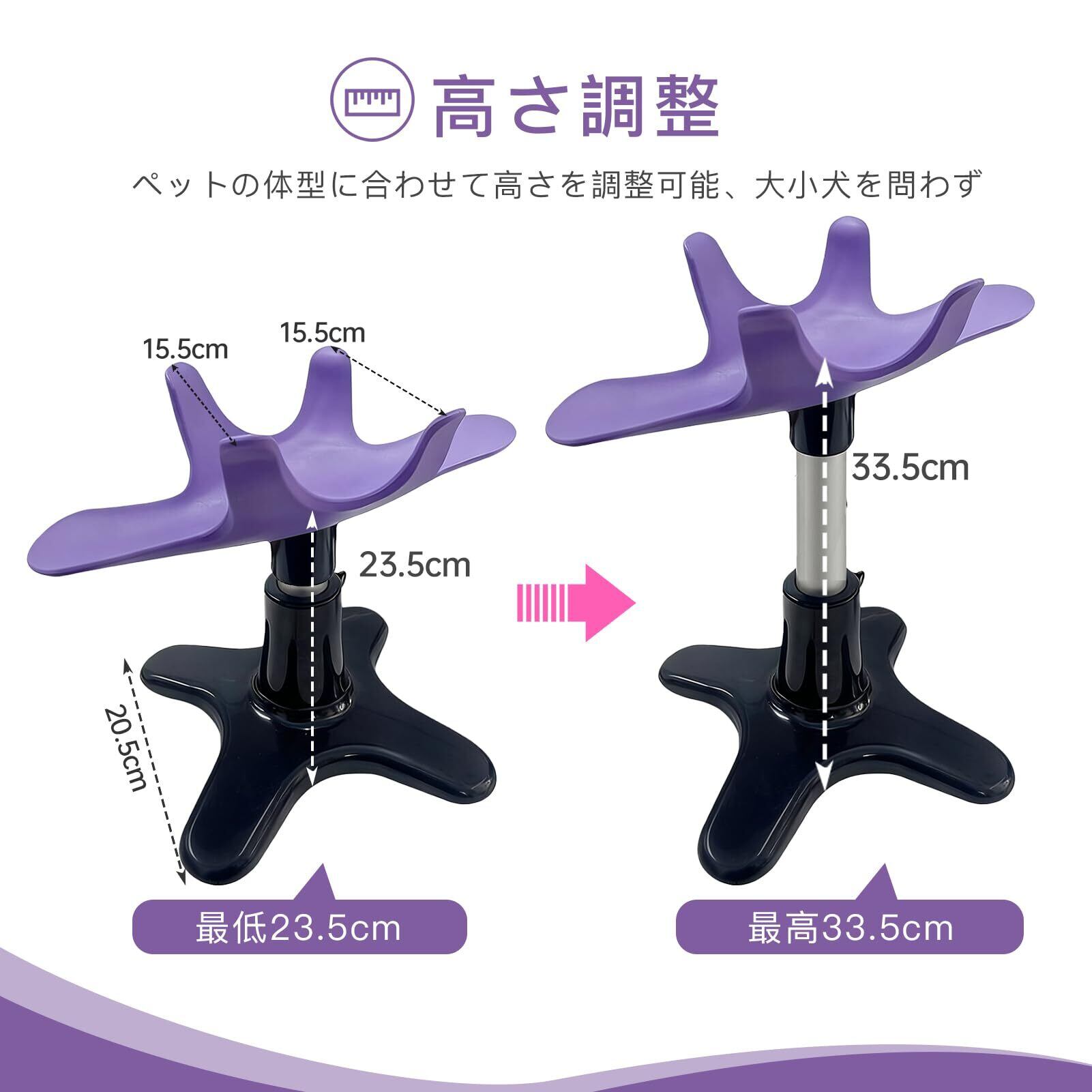 高さ調節機能: 23.5cmから33.5cmまで調整可能で、小型犬から大型犬まで対応できる設計です
