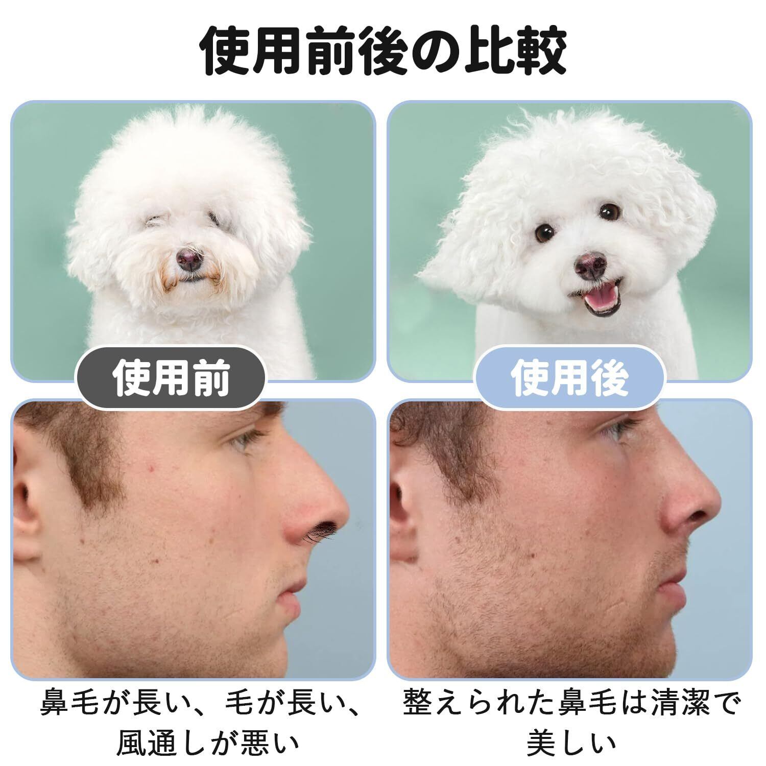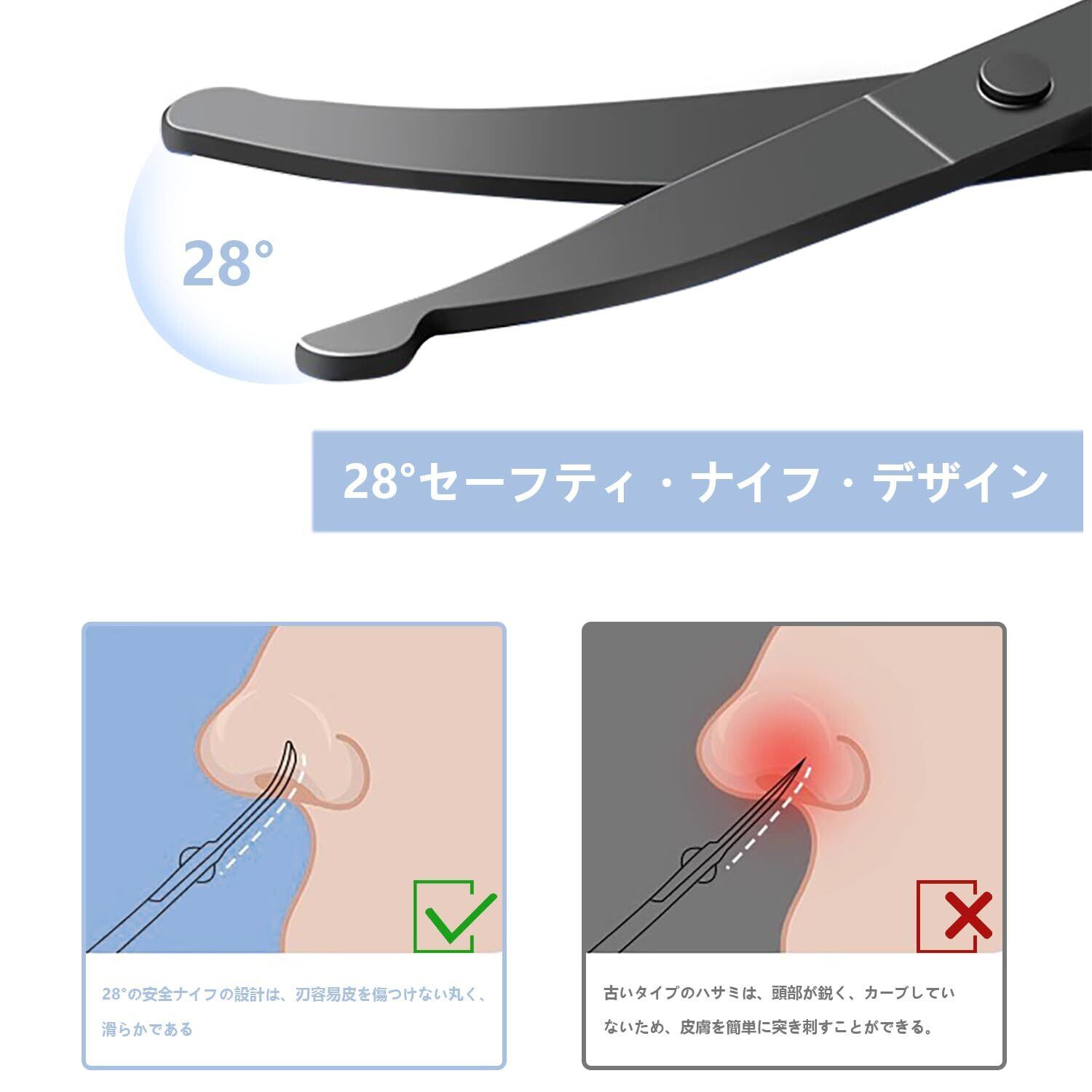 【安全性が高い】トリミングは人体工学に基づいた設計を採用し、プロでも初心者でも使いやすく作られています。刃先は安全性を考慮した丸みを帯びたデザインです。1.鼻腔の内部を傷つけにくい丸刃仕様柔らかくデリケートな鼻腔の中を傷つけないように、刃先は丸い形状にしました。肌にやさしいつくりです。小さめのサイズ感で扱いやすく、鼻毛カットに適しているハサミです。2.ペットが動き回っても傷つきません。ペットの毛や爪、足の毛などのトリミングに使用してもストレスフリーです。