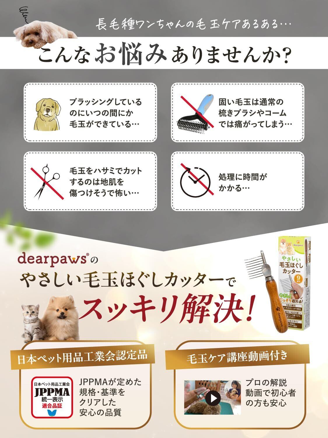 【現役トリマー監修】やさしい毛玉ほぐしカッター 犬 猫 コーム 長毛種 痛くない 毛玉取り 9枚刃 ごっそり【JPPMA認定品】 毛玉専用