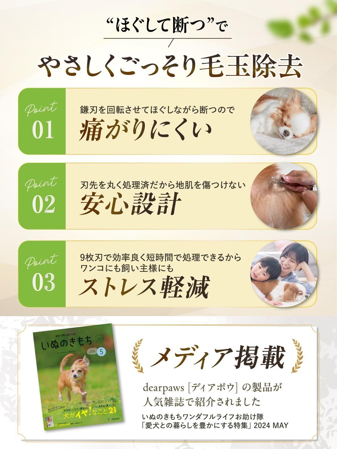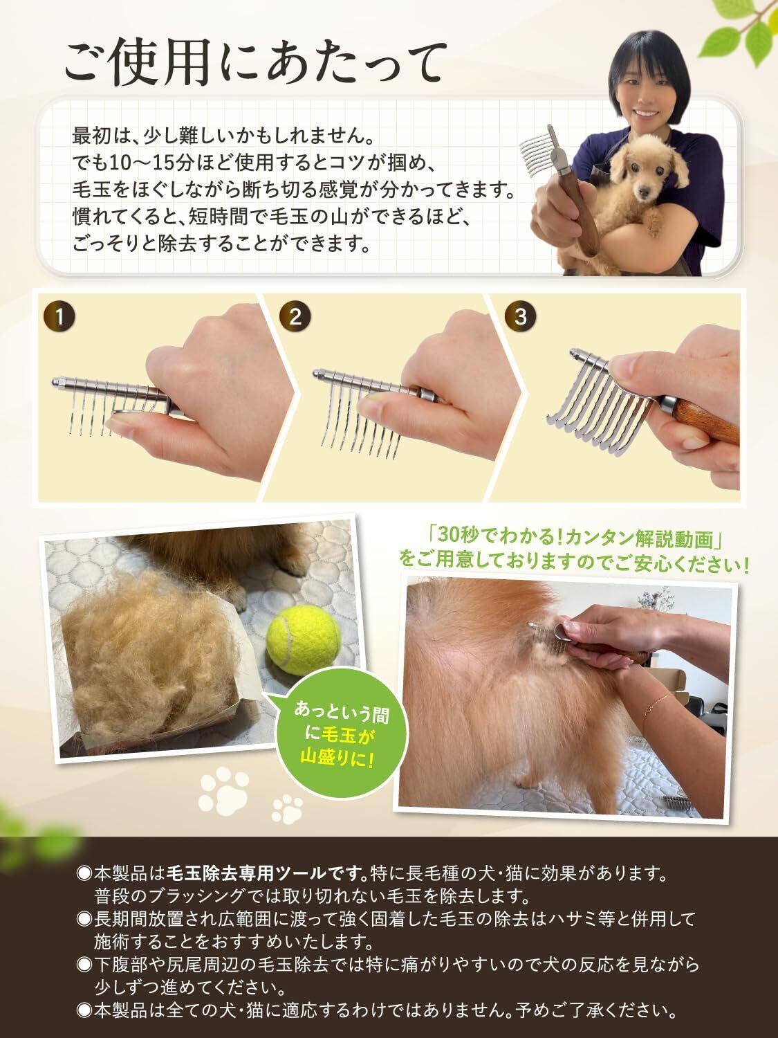 ご注意:●刃には絶対に触れないでください。●ペット用毛玉取り専用です。用途以外に使用しないでください。●小さなお子様やペットの手(口)の届かない場所に保管してください。●皮膚を傷つけないよう、刃を強く押し当てないでください。●皮膚に異常がある部分や濡れた毛には使用しないでください。●使用後は毛やゴミを取り除き、乾いた状態で保管してください。