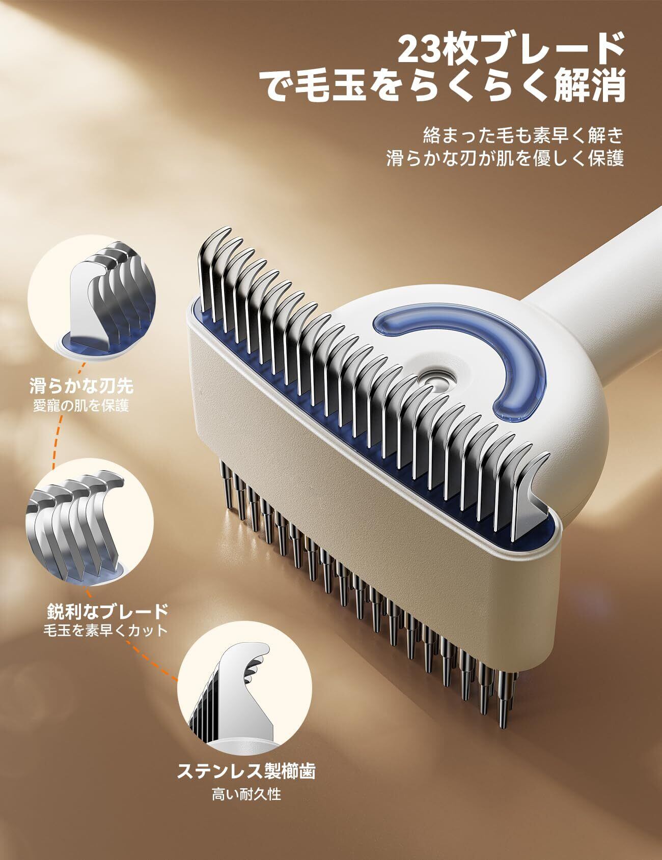 鋼製23枚ブレードで、毛玉もらくらく解消:本猫ブラシは、厚く・硬い・絡みやすい毛質に特化。超広幅23歯が、アウトドア遊び後の足やお腹の泥・ごみ・頑固な毛玉までしっかり除去。