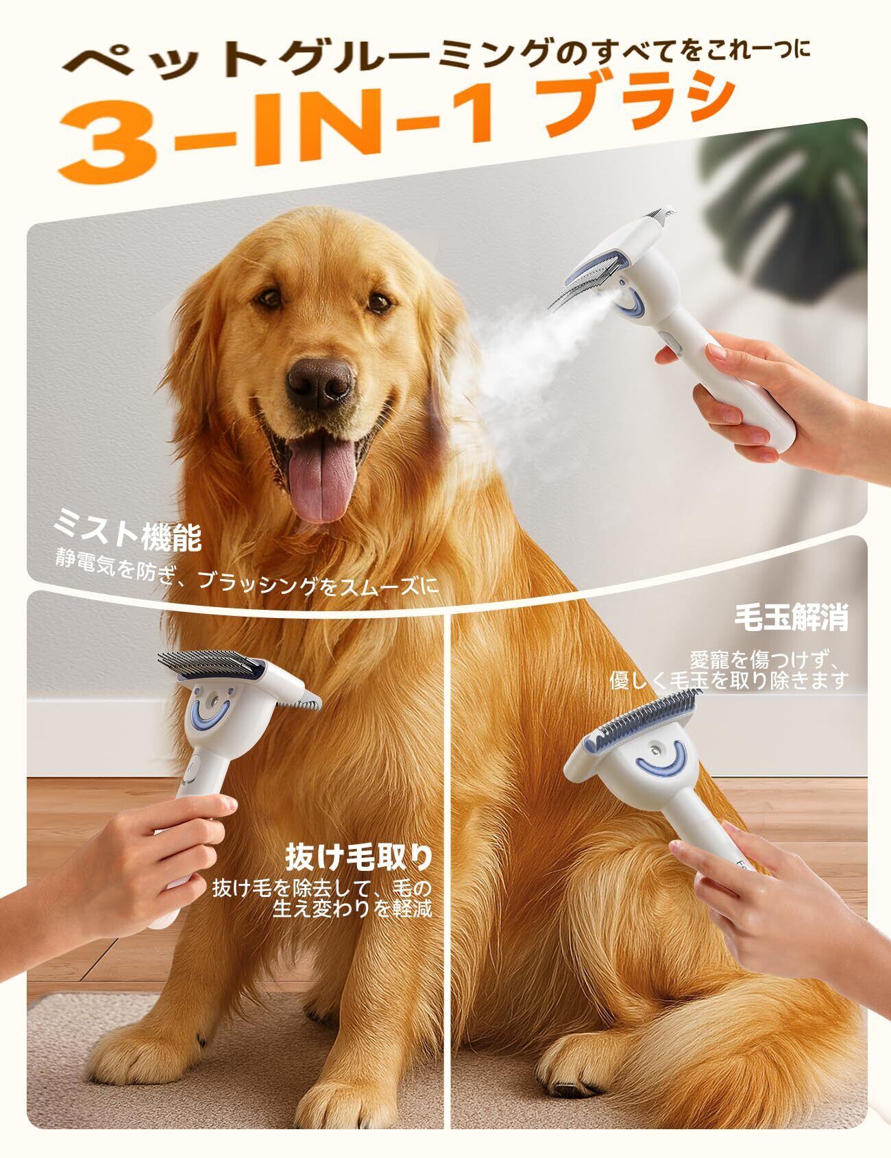 多機能毛玉・抜け毛ブラシ スチーム機能付き:この犬 ブラシはペット用スチームブラシ、毛玉解消、抜け毛ケア、マッサージ、アンダーコア整毛の5機能を一本に集約。長毛の巻き毛を持つ犬猫、および毛玉ができやすく抜け毛の多い中長毛のペットに最適。換毛期や沐浴が苦手なペットにも、両面調整ミストが肌を鎮め静電気を抑制。ストレスないブラッシングを実現します。