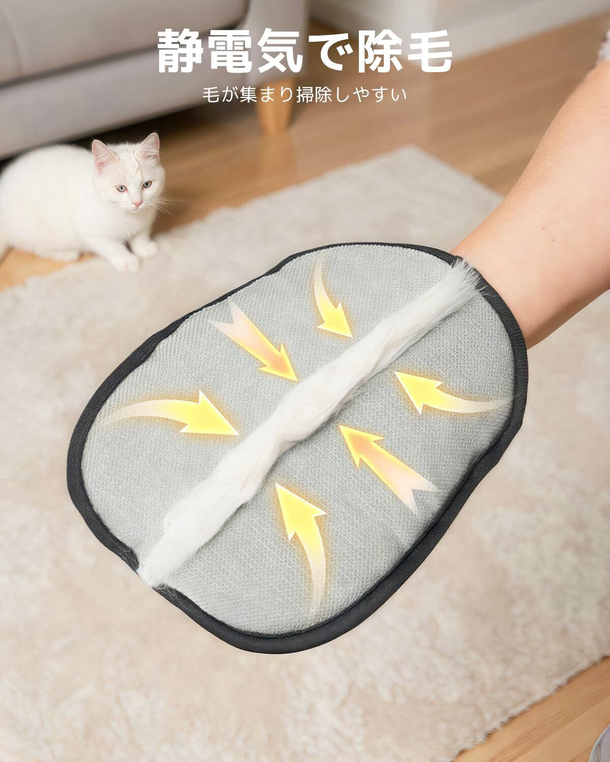 【両面静電毛取り】静電技術を両面に搭載したペット用毛取りグローブ。さっと往復するだけで抜け毛がまとめて取れ、お手入れがラクラク。※1、ペットに直接使わないでください。2、ツルツルした布地にはご使用をお控えください。デニムやアイスシルクなど、滑りやすい素材では毛が絡みにくく、効果が半減してしまいます。