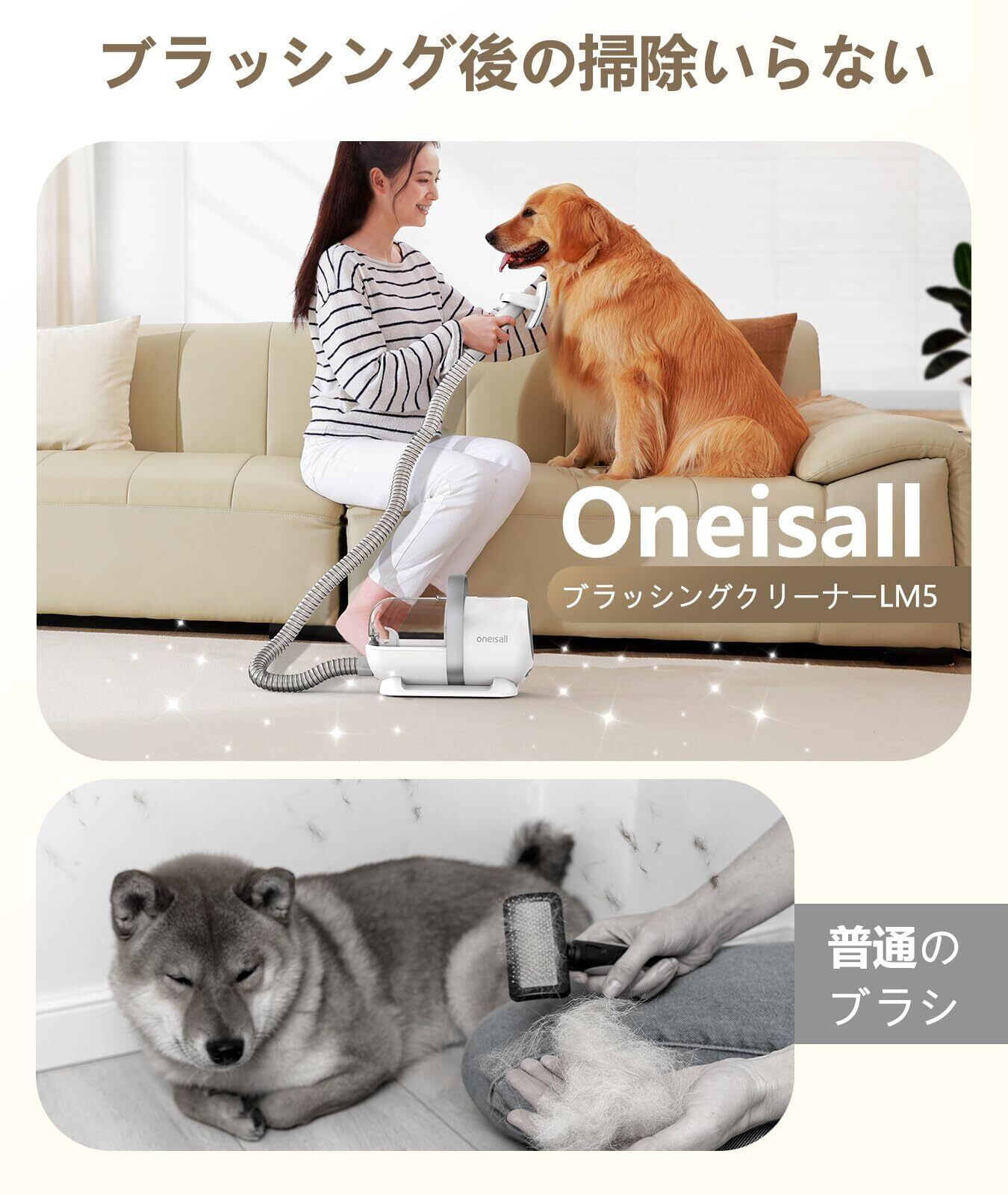 【ブラシと掃除機を一体化したペットの毛 掃除機】Oneisall LM5はペットの抜け毛対策に専念した設計で、ブラッシングと同時に、抜け毛などを簡単に吸い込むことができます。 二つの櫛によってペットの体の毛はもちろん、手足、眼鼻周辺、脇の下などの細部のケアもちゃんとできます。その他カーペットや服、ソファーなどの家具の掃除までできる一体化セットによって、いつも綺麗な家庭環境を提供できます。