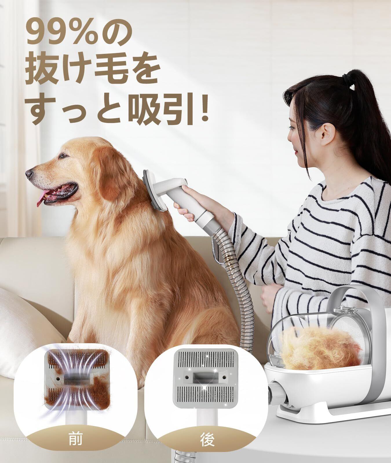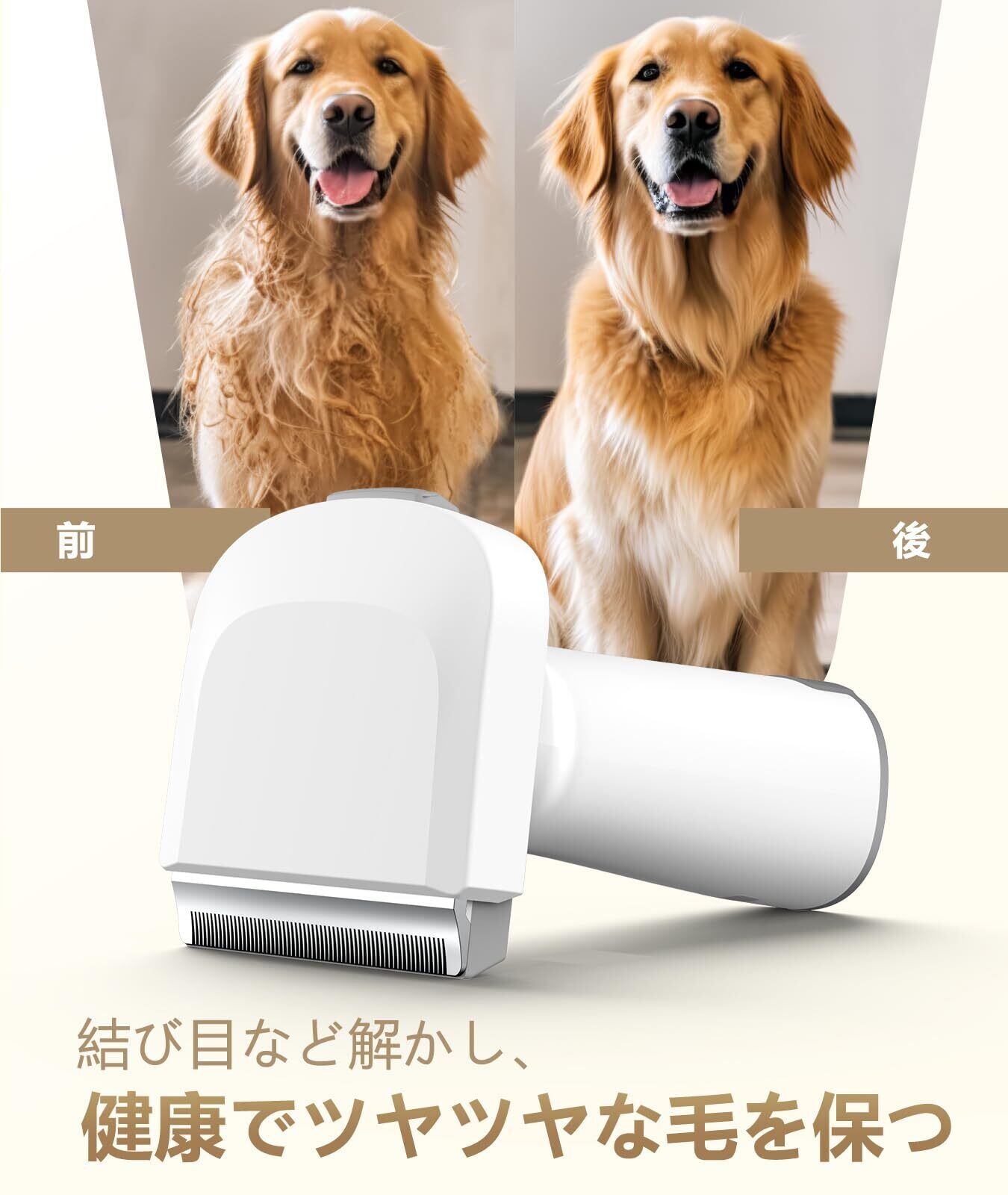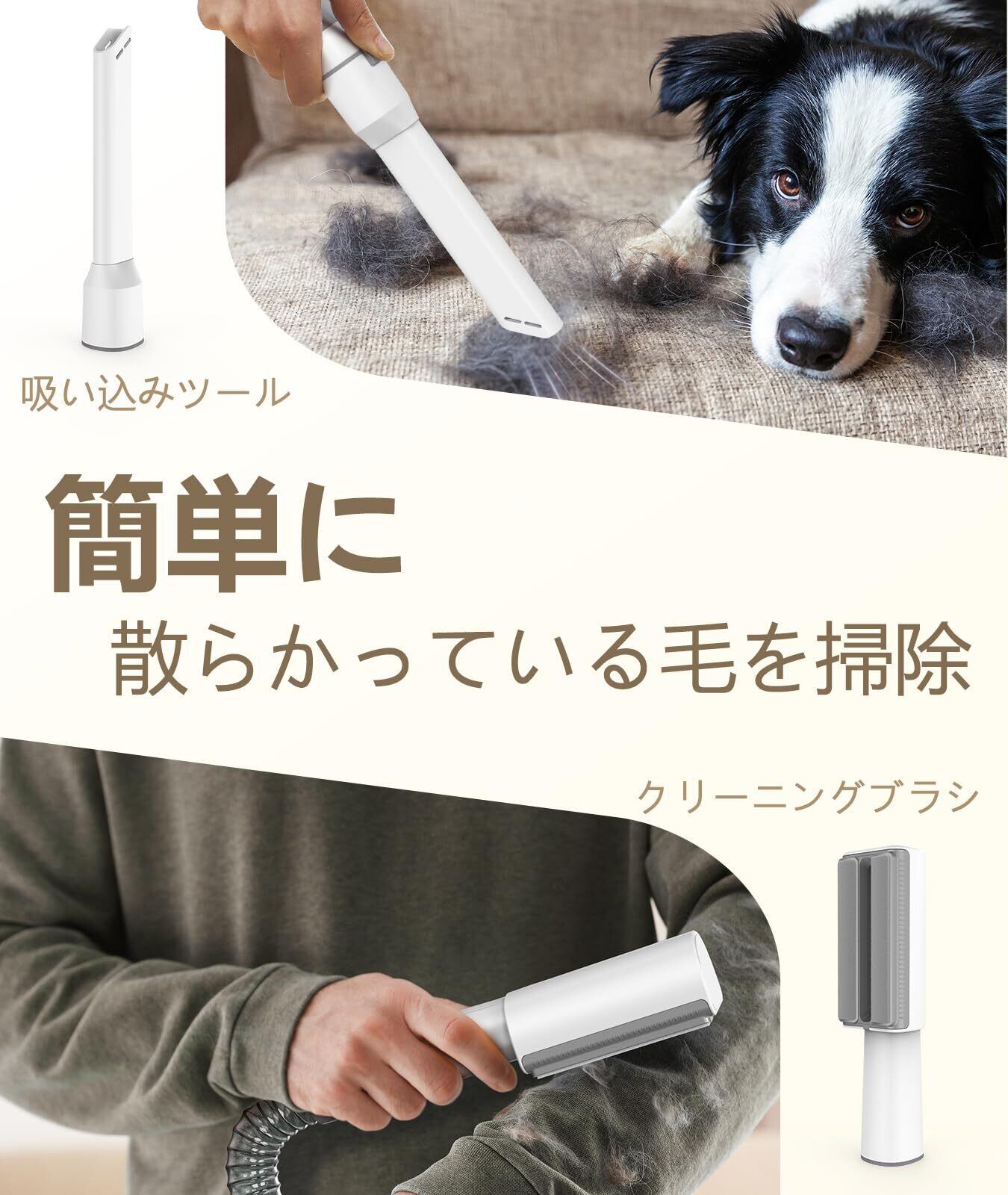 【強い吸引力と豊富な抜け毛掃除部品】最大10kPaの強吸引力で、あっという間に抜け毛や浮いた毛(死毛)を99%除去できます。またグルーミングブラシ、すきブラシ、クリーニングブラシ、吸い込みツールなどの部品で、犬猫の体格にかからず、ブラッシングと掃除を一台でできます。