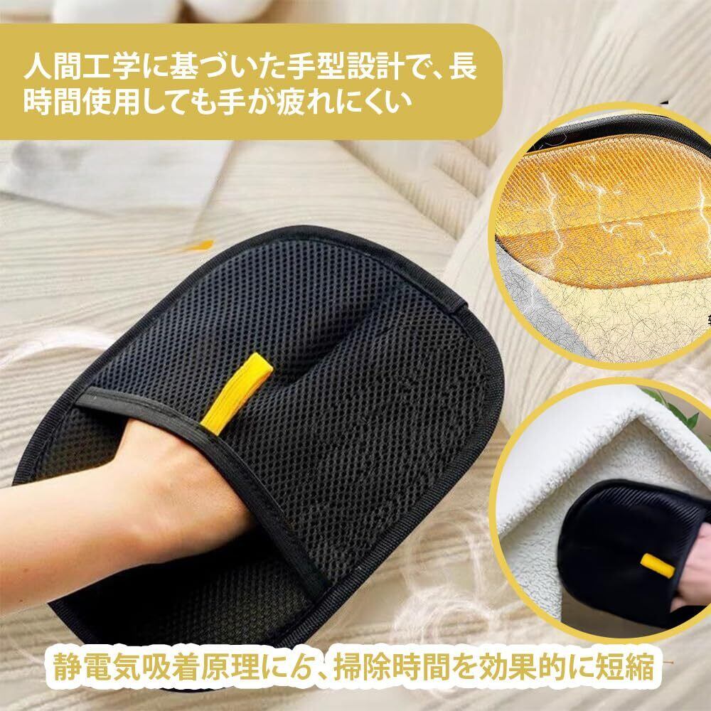 手の形にフィットする人間工学設計で、使用時の快適性を確保し。静電気の力で働くこのペット用お掃除グッズは、織物表面のペットの毛を軽く吸着し、グルーミング時間を効果的に短縮できるため、左右どちらの手にも装着可能です。